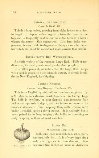 | Keywords: The field and garden vegetables of America (Page 134) (6002092903).jpg 134 ALLIACEOUS PLANTS <br> Fusiform or Cow-Horn <br> Corne de Bceuf Vil <br> This is a large onion growing from eight inches to a foot <br> in length It tapers rather regularly from the base to the <br> top and is frequently bent or curved in the form of a horn ; <br> whence the name Skin copper-red It is late lacks com- <br> pactness is very liable to degenerate decays soon after being <br> harvested and must be considered more curious than useful <br> Intermediate Red Wethersfield <br> An early variety of the common Large Red Bulb of me- <br> dium size flattened ; neck small ; color deep purple <br> It is rather pungent yet milder than the Large Red ; keeps <br> well ; and is grown to a considerable extent in certain locali- <br> ties in New England for shipping <br> James's Keeping <br> James's Long Keeping De James Vil <br> This is an English hybrid said to have been originated by <br> a Mr James an extensive market-gardener in Surry Eng <br> The bulb is pyriform or pear-shaped ; and measures four <br> inches and upwards in depth and two inches or more at its <br> broadest diameter Skin copper-yellow ” the coating next <br> under it reddish-brown ; flavor strong It is not early but is <br> much prized for its long keeping ; the bulbs not sprouting so <br> early in spring as those of most varieties <br> Large Red <br> Wethersfield Large Red <br> Bulb sometimes roundish but when pure <br> comparatively flat It is of very large size ; <br> and when grown in favorable soil often <br> measures five inches or more in diameter 29062472 92326 42073 Page 134 Text http //www biodiversitylibrary org/page/29062472 1863 10 5962/bhl title 42073 Burr Fearing NameFound Corne Biodiversity Heritage Library The field and garden vegetables of America United States Varieties Vegetable gardening Vegetables Library Congress bhl page 29062472 dc identifier http //biodiversitylibrary org/page/29062472 united states Information field Flickr posted date ISOdate 2011-08-02 CC-BY-2 0 BioDivLibrary https //flickr com/photos/61021753 N02/6002092903 2015-09-10 20 54 56 cc-by-2 0 PD-old-70-1923 The field and garden vegetables of America Photos uploaded from Flickr by Fæ using a script |