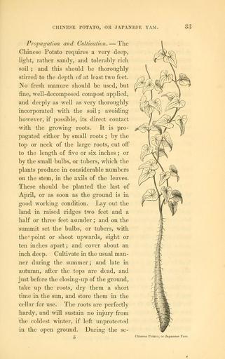 | Keywords: The field and garden vegetables of America (Page 33) (6002635390).jpg CHINESE POTATO OR JAPANESE YAM <br> 33 <br> Propagation and Cultivation The <br> Chinese Potato requires a very deep <br> light rather sandy and tolerably rich <br> soil ; and this should be thoroughly <br> stirred to the depth of at least two feet <br> No fresh manure should be used but <br> fine well-decomposed compost applied <br> and deeply as well as very thoroughly <br> incorporated with the soil ; avoiding <br> however if possible its direct contact <br> with the growing roots It is pro- <br> pagated either by small roots ; by the <br> top or neck of the large roots cut off <br> to the length of five or six inches ; or <br> by the small bulbs or tubers which the <br> plants produce in considerable numbers <br> on the stem in the axils of the leaves <br> These should be planted the last of <br> April or as soon as the ground is in <br> good working condition Lay out the <br> land in raised ridges two feet and a <br> half or three feet asunder ; and on the <br> summit set the bulbs or tubers with <br> the point or shoot upwards eight or <br> ten inches apart ; and cover about an <br> inch deep Cultivate in the usual man- <br> ner during the summer; and late in <br> autumn after the tops are dead and <br> just before the closing-up of the ground <br> take up the roots dry them a short <br> time in the sun and store them in the <br> cellar for use The roots are perfectly <br> hardy and will sustain no injury from <br> the coldest winter if left unprotected <br> in the open ground During the se- <br> Chinese Potato or Japanese Ys 29062333 92326 42073 Page 33 Text http //www biodiversitylibrary org/page/29062333 1863 10 5962/bhl title 42073 Burr Fearing Biodiversity Heritage Library The field and garden vegetables of America United States Varieties Vegetable gardening Vegetables Library Congress bhl page 29062333 dc identifier http //biodiversitylibrary org/page/29062333 united states Information field Flickr posted date ISOdate 2011-08-02 CC-BY-2 0 BioDivLibrary https //flickr com/photos/61021753 N02/6002635390 2015-09-10 20 55 27 cc-by-2 0 PD-old-70-1923 The field and garden vegetables of America Photos uploaded from Flickr by FĂŚ using a script |