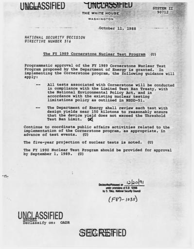 | Keywords: The FY 1989 Cornerstone Nuclear Test Program - NARA - 198403.jpg Scope and content General notes 198403 Local identifier President 1981-1989 Reagan National Security Council 1981 - 1989 Ronald Reagan Library NLRR 40 Presidential Drive Simi Valley CA 93065-0600 1989-10-11 Record group Collection RR-NSC Numbered National Security Policy Papers 1981 - 1989 Record group ARC 1189 National Security Decision Directives compiled 02/25/1981 - 01/19/1989 Series ARC 198166 File unit File unit ARC Variant control numbers NAIL Control Number NLS-NSC-NSDD-316 Other versions <gallery> File The_FY_1989_Cornerstone_Nuclear_Test_Program_-_NARA_-_198403 tif tif File The_FY_1989_Cornerstone_Nuclear_Test_Program_-_NARA_-_198403 jpg jpg </gallery> NARA-cooperation PD-USGov Operation Cornerstone Presidential Decision Directives Reagan |