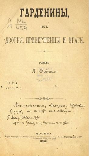 Keywords: The Gardenins 1890.jpg ru Ст аница пе вого издания омана А И Э теля Га денины en The first page of the first edition of the novel The Gardenins by A I Ertel 2015-11-09 РГБ http //dlib rsl ru/viewer/01003659315 page 3 http //dlib rsl ru/viewer/01003659315 page 3 other versions PD-old-70-1923 Russian literature Literature Writers from Russia Uploaded with UploadWizard