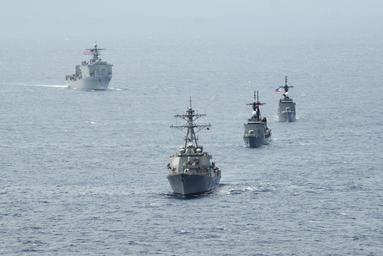 Keywords: The guided missile destroyer USS John S. McCain (DDG 56), front; the Philippine frigates BRP Gregorio del Pilar (PF 15) and BRP Ramon Alcaraz (PF 16); and the amphibious dock landing ship USS Ashland (LSD 48) 140628-N-YU572-149.jpg en The guided missile destroyer USS John S McCain DDG 56 front; the Philippine frigates BRP Gregorio del Pilar PF 15 and BRP Ramon Alcaraz PF 16 ; and the amphibious dock landing ship USS Ashland LSD 48 left are underway in formation during Cooperation Afloat Readiness and Training CARAT Philippines 2014 in the South China Sea June 28 2014 CARAT is a series of bilateral exercises held annually in Southeast Asia to strengthen relationships and enhance force readiness 2014-06-28 MC1 Jay C Pugh http //www defenseimagery mil/imageRetrieve action guid 19a2af73f16ebc1c2af7acf394f4fa61edd23610 t 2 Public domain photograph from defenseimagery mil http //www defenseimagery mil/imagery html guid 19a2af73f16ebc1c2af7acf394f4fa61edd23610 140628-N-YU572-149 2014-07-01 Unknown PD-USGov-Military-Navy USS Ashland LSD-48 USS John S McCain DDG-56 Cooperation Afloat Readiness and Training 2014 Images from DoD uploaded by Fæ |