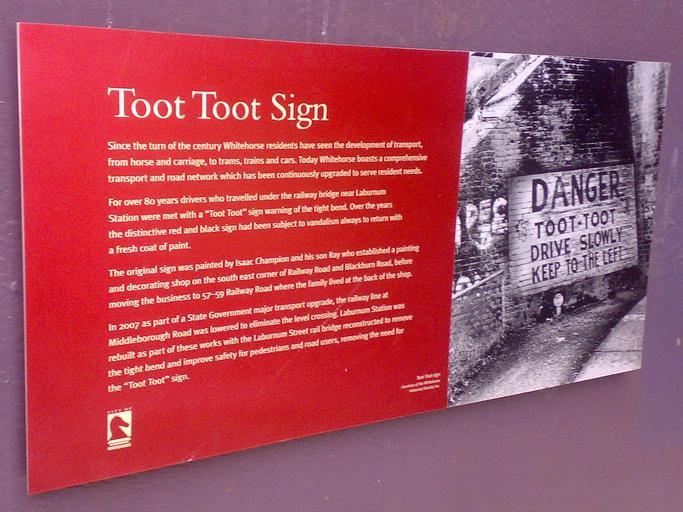 | Keywords: The Laburnum Railway Station 'Toot-Toot' sign.jpg  en Photo of a plaque commemorating the Laburnum Railway Station 'Toot-Toot' sign 2011-05-31 own Stewart Allen -37 820569 145 141236 cc-zero Uploaded with UploadWizard Laburnum railway station Melbourne |