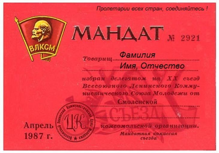 View Original: | The_mandate_of_delegate_the_all-Union_Congress_Komsomol_USSR,_1987.jpg (500x350) | |||