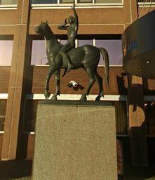 | Keywords: sutton surrey sutton, surrey suttonsurrey sutton, london suttonlondon sculpture sir david wynne sirdavidwynne london london borough of sutton londonboroughofsutton reed the quadrant thequadrant horse horse and rider horseandrider 1981 art statue public art publicart See Wikipedia article: The Messenger is a statue by the English sculptor David Wynne, OBE of a horse and rider. It was installed in the town centre of Sutton in Greater London, England in 1981. Features: The statue features a horse and rider, created in bronze with very dark patination. It is located directly outside the main entrance to Quadrant House (in the Quadrant), adjacent to Sutton railway station. The horse, with a slightly raised left leg, looks towards the station. The rider, seated bareback, raises his left hand in the air above his head and his right hand to his mouth, as if calling out. It is fully life-size and mounted on a 7 foot plinth of marble and granite slabs. The total height is 150 inches. Commissioning and the brief: The statue was commissioned by the then Business Press International Ltd, and upkeep of the work now falls to Reed Business Information, who occupy Quadrant House. It was a major commission for Wynne, which took four years from his first idea and inspiration on receipt of the brief through roughing out, refining and foundry to the final unveiling and installation. The brief given to him by the company was to illustrate the fundamental business of the company, namely communication, but to convey the idea, rather than simply to represent the work of the company in a direct or very obvious way. Location: The company had initially considered that the work should be installed high up, above the entrance lobby. However, Wynne advised against this, feeling that the distance created would militate against the engagement he wanted people to have with the work. It would be perceived as two-dimensional, depriving people of the full three-dimensions they would feel by walking around it. So the statue was installed at ground level in front of the entrance to the building, enabling people to get close up to it. Moment of inspiration: Having agreed the overall idea that the work was to convey, Wynne had to consider what actual form the sculpture would take to best capture the idea of communication. When inspiration came to him, it did so "like a flash of light, complete", as he put it: "A tall wise horse that had never known a bridle, a magic horse if you like, poised, one foot pointing to the centre of the earth; head up, nostrils flared, about to whip round and plunge away. On his back a carefree boy, wild as the horse, calling out to his friends, who have forgotten that they too are heirs to his kingdom." Preparation: As part of his preparation, Wynne visited Italy to see the Equestrian Statue of Marcus Aurelius in Rome and the Horses of Saint Mark in Venice. Unveiling: Describing his thoughts moments before the unveiling, David Wynne wrote in his 1982 book The Messenger. "It is a proud moment for the sculptor when he sees a crowd of expectant and rather puzzled people gazing at an ungainly shrouded shape in the most prominent position outside a gleaming new building. Will they be surprised, pleased, disappointed or even appalled when the cover comes off? Too late to change it now!" Wynne's idea of the relationship between the horse and man: In his introductory essay in the book The Messenger, Lucius Noël notes Wynne's dislike for statues where the horse is shown as merely the support for the rider. Noël notes the way that Wynne highlights the interrelationship between horse and rider in the work, as he did in his previous two horse and rider sculptures. While noting the greater reality in the work than its two equestrian predecessors, he stresses the strong symbolism in the work. He writes: "The rider, a young man, is giving his message to his audience, and seems to be saying that there is another world that all should know about. But the horse is just as important as the man. His is, in fact, more concious than the man, and has his feet firmly planted on the ground, one hoof pointing to the centre of the earth. They are a team, and the overall impression is that each needs the other: man needs the horse, as much as the horse needs man." Noël notes how this analysis ties in with Wynne's wider views about animals: "We must share the Earth with the animals, who have as much right to it as we do. To find a way to live in peace with the animals is our duty." See Wikipedia article: The Messenger is a statue by the English sculptor David Wynne, OBE of a horse and rider. It was installed in the town centre of Sutton in Greater London, England in 1981. Features: The statue features a horse and rider, created in bronze with very dark patination. It is located directly outside the main entrance to Quadrant House (in the Quadrant), adjacent to Sutton railway station. The horse, with a slightly raised left leg, looks towards the station. The rider, seated bareback, raises his left hand in the air above his head and his right hand to his mouth, as if calling out. It is fully life-size and mounted on a 7 foot plinth of marble and granite slabs. The total height is 150 inches. Commissioning and the brief: The statue was commissioned by the then Business Press International Ltd, and upkeep of the work now falls to Reed Business Information, who occupy Quadrant House. It was a major commission for Wynne, which took four years from his first idea and inspiration on receipt of the brief through roughing out, refining and foundry to the final unveiling and installation. The brief given to him by the company was to illustrate the fundamental business of the company, namely communication, but to convey the idea, rather than simply to represent the work of the company in a direct or very obvious way. Location: The company had initially considered that the work should be installed high up, above the entrance 