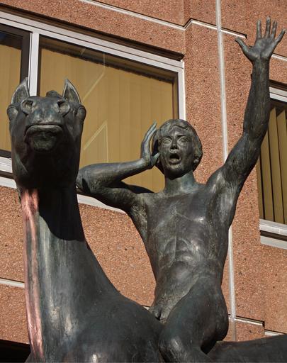 | Keywords: sutton surrey sutton, surrey suttonsurrey sutton, london suttonlondon sculpture sir david wynne sirdavidwynne london london borough of sutton londonboroughofsutton reed the quadrant thequadrant horse horse and rider horseandrider 1981 art statue public art publicart See Wikipedia article: The Messenger is a statue by the English sculptor David Wynne, OBE of a horse and rider. It was installed in the town centre of Sutton in Greater London, England in 1981. Features: The statue features a horse and rider, created in bronze with very dark patination. It is located directly outside the main entrance to Quadrant House (in the Quadrant), adjacent to Sutton railway station. The horse, with a slightly raised left leg, looks towards the station. The rider, seated bareback, raises his left hand in the air above his head and his right hand to his mouth, as if calling out. It is fully life-size and mounted on a 7 foot plinth of marble and granite slabs. The total height is 150 inches. Commissioning and the brief: The statue was commissioned by the then Business Press International Ltd, and upkeep of the work now falls to Reed Business Information, who occupy Quadrant House. It was a major commission for Wynne, which took four years from his first idea and inspiration on receipt of the brief through roughing out, refining and foundry to the final unveiling and installation. The brief given to him by the company was to illustrate the fundamental business of the company, namely communication, but to convey the idea, rather than simply to represent the work of the company in a direct or very obvious way. Location: The company had initially considered that the work should be installed high up, above the entrance lobby. However, Wynne advised against this, feeling that the distance created would militate against the engagement he wanted people to have with the work. It would be perceived as two-dimensional, depriving people of the full three-dimensions they would feel by walking around it. So the statue was installed at ground level in front of the entrance to the building, enabling people to get close up to it. Moment of inspiration: Having agreed the overall idea that the work was to convey, Wynne had to consider what actual form the sculpture would take to best capture the idea of communication. When inspiration came to him, it did so "like a flash of light, complete", as he put it: "A tall wise horse that had never known a bridle, a magic horse if you like, poised, one foot pointing to the centre of the earth; head up, nostrils flared, about to whip round and plunge away. On his back a carefree boy, wild as the horse, calling out to his friends, who have forgotten that they too are heirs to his kingdom." Preparation: As part of his preparation, Wynne visited Italy to see the Equestrian Statue of Marcus Aurelius in Rome and the Horses of Saint Mark in Venice. Unveiling: Describing his thoughts moments before the unveiling, David Wynne wrote in his 1982 book The Messenger. "It is a proud moment for the sculptor when he sees a crowd of expectant and rather puzzled people gazing at an ungainly shrouded shape in the most prominent position outside a gleaming new building. Will they be surprised, pleased, disappointed or even appalled when the cover comes off? Too late to change it now!" Wynne's idea of the relationship between the horse and man: In his introductory essay in the book The Messenger, Lucius Noël notes Wynne's dislike for statues where the horse is shown as merely the support for the rider. Noël notes the way that Wynne highlights the interrelationship between horse and rider in the work, as he did in his previous two horse and rider sculptures. While noting the greater reality in the work than its two equestrian predecessors, he stresses the strong symbolism in the work. He writes: "The rider, a young man, is giving his message to his audience, and seems to be saying that there is another world that all should know about. But the horse is just as important as the man. His is, in fact, more concious than the man, and has his feet firmly planted on the ground, one hoof pointing to the centre of the earth. They are a team, and the overall impression is that each needs the other: man needs the horse, as much as the horse needs man." Noël notes how this analysis ties in with Wynne's wider views about animals: "We must share the Earth with the animals, who have as much right to it as we do. To find a way to live in peace with the animals is our duty." See Wikipedia article: The Messenger is a statue by the English sculptor David Wynne, OBE of a horse and rider. It was installed in the town centre of Sutton in Greater London, England in 1981. Features: The statue features a horse and rider, created in bronze with very dark patination. It is located directly outside the main entrance to Quadrant House (in the Quadrant), adjacent to Sutton railway station. The horse, with a slightly raised left leg, looks towards the station. The rider, seated bareback, raises his left hand in the air above his head and his right hand to his mouth, as if calling out. It is fully life-size and mounted on a 7 foot plinth of marble and granite slabs. The total height is 150 inches. Commissioning and the brief: The statue was commissioned by the then Business Press International Ltd, and upkeep of the work now falls to Reed Business Information, who occupy Quadrant House. It was a major commission for Wynne, which took four years from his first idea and inspiration on receipt of the brief through roughing out, refining and foundry to the final unveiling and installation. The brief given to him by the company was to illustrate the fundamental business of the company, namely communication, but to convey the idea, rather than simply to represent the work of the company in a direct or very obvious way. Location: The company had initially considered that the work should be installed high up, above the entrance 