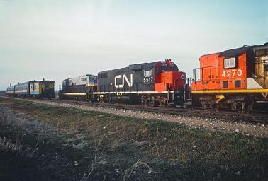 Keywords: canadian national canadiannational railroad outdoor vehicle train locomotive When I asked the Canadian Railroads Group of Train Orders about these photos, tsokolan responded, "Looks like Roger rode the "Muskeg Mixed" which IIRC was the last mixed train on the CNR. Service was between Edmonton and Fort McMurray AB and ended in the early 1980s." Roger Puta took pictures of the train working at Lac La Biche, Alberta and rode the train from there both in the cab and in the coach. I'm pretty sure he rode to Edmonton. CN 4603, CN 5517 and CN 4270 at Lac La Biche. CN GP9 4603 GP9 was Northern Alberta Railway 202 and it is now a slug CN 252. When I asked the Canadian Railroads Group of Train Orders about these photos, tsokolan responded, "Looks like Roger rode the "Muskeg Mixed" which IIRC was the last mixed train on the CNR. Service was between Edmonton and Fort McMurray AB and ended in the early 1980s." Roger Puta took pictures of the train working at Lac La Biche, Alberta and rode the train from there both in the cab and in the coach. I'm pretty sure he rode to Edmonton. CN 4603, CN 5517 and CN 4270 at Lac La Biche. CN GP9 4603 GP9 was Northern Alberta Railway 202 and it is now a slug CN 252. When I asked the Canadian Railroads Group of Train Orders about these photos, tsokolan responded, "Looks like Roger rode the "Muskeg Mixed" which IIRC was the last mixed train on the CNR. Service was between Edmonton and Fort McMurray AB and ended in the early 1980s."