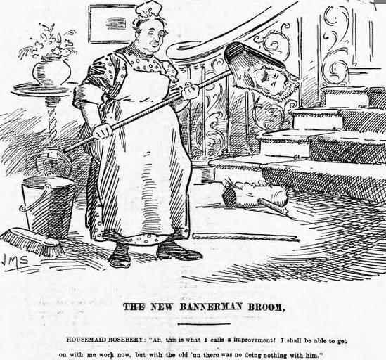 Keywords: The New Bannerman Broom - JM Staniforth.png en Political cartoon by JM Staniforth The Earl of Rosebery as a housemaid declares delight at her new broom Henry Campbell-Bannerman who has replaced William Vernon Harcourt as Liberal leader Harcourt's broom lies broken on the floor http //papuraunewyddcymru llgc org uk/en/page/view/3282963 Evening Express Joseph Morewood Staniforth 1899-02-08 Cartoons by Joseph Morewood Staniforth William Vernon Harcourt politician Henry Campbell-Bannerman Archibald Primrose 5th Earl of Rosebery 1890s political cartoons 1899 in the United Kingdom Political cartoons of the United Kingdom Brooms in art Cross-dressing Liberal Party UK Unclear-PD-US-old-70 |