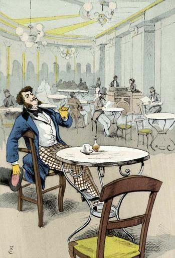 | Keywords: The Palmy Days of the Café de la Rotonde. In the Palais-Royal, 1868.jpg Artwork This plate depicts a man with a mustache smoking at the Café de la Rotonde situated in the Tuileries He is wearing checked pants over two-tone booots as well as a blue jacket Abstract sources Boucher François 20 000 Years of Fashion New York Harry N Abrams Inc 1967 Ruppert Jacques Le Costume Français Paris Flammarion 1996 1898 colored plate 10 x 15 cm Institution Brown University Library object history exhibition history credit line Published in Octave Uzanne Fashion in Paris the various phases of feminine taste and aesthetics from 1797 to 1897 London William Heinemann 1898 accession number 1150468554482990 PD-old Les modes de Paris 077 Fashion plates depicting men Images of Paris from the Brown University Library 1868 in Paris Fashion in 1868 Historical images of Palais Royal Cafés in Paris 1er arrondissement Restaurant tables in Paris People sitting at tables in art Historical images of cafés in Paris |