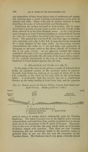 Keywords: The Quarterly journal of the Geological Society of London (13204607575).jpg 148 <br> DK H HICKS ON THE METAMOEPHIC AND <br> any supposition of their being higher beds of sandstones and quartz- <br> ites reposing upon a lower quartzite-and-limestone series must be <br> entirely cast aside These rocks will be further referred to when <br> describing the areas of Achnashellach and Strathcarron <br> Continuing the section eastward of Loch Coulan still in some- <br> what broken ground we come upon a series of rocks entirely unlike <br> those referred to as the Glen-Docherty series As the road private <br> road belonging to Lord AYolverton leading to Achnashellach crosses <br> the ridge the mica-schists described in the Appendix note no 6 are <br> found The general dip is to the W W ; but here t ey are consider- <br> ably contorted and a dip to the S E is soon afterwards recognized <br> for a short distance in the same rocks In descending towards <br> Achnashellach the rocks no 7 are met with and apparently as <br> belonging to the same series as the above though the evidence of <br> this is not quite certain As we approach towards the station <br> undoubted old rocks of the type described under no 9 aud a reddish <br> felspathic group not unlike the old rocks of the Logan valley appear <br> On the roadside immediately to the west of the station Torridon <br> Sandstone is found faulted against this old rock <br> 5 Achnashellach and Strathcarron fig 2 <br> In the gorge of the river in the private grounds of Achnashellach <br> Lodge an excellent section of the quartzite series is exposed <br> Towards Loch Doule the beds dip at an angle of about 45° to the <br> S E evidently as the effect of the main fault in the Loch-Doule <br> vaJley A moderatelv high dip prevails also for a considerable <br> distance up the valley leading to Loch Cony Lair and the quartzite <br> Eu <br> 2 ” Section across the Carron Valley between Loch Doule and <br> Loch Carron Scale J inch to 1 mile <br> N N -W <br> S S E <br> Branch of <br> Attadale Eiver <br> c Gairloch and Een-Eyn Series <br> d Torridon Sandstone <br> e Limestone Series <br> Quartz Eock <br> series is seen as if resting almost conformably upon the Torridon <br> Sandstone The latter is passed over at the highest point between <br> Achnashellach and Loch Corry Lair and the succession is to be clearly <br> made out in the mountains to the N and S of the pass The moun- <br> tains to the west of this lake also seem wholly made up of Torridon <br> Sandstone capped with quartzite That these are true Torridon <br> Sandstones and not subordinate bands in the quartzite series is <br> perfectly clear to any one who has seen the succession on the <br> Torridon shores The thickness also is very great evidently several 36928733 113681 51125 Page 148 Text 39 http //www biodiversitylibrary org/page/36928733 1883 Geological Society of London Biodiversity Heritage Library The Quarterly journal of the Geological Society of London v 39 1883 Geology Periodicals Smithsonian Libraries bhl page 36928733 dc identifier http //biodiversitylibrary org/page/36928733 smithsonian libraries Information field Flickr posted date ISOdate 2014-03-16 Check categories 2015 August 26 CC-BY-2 0 BioDivLibrary https //flickr com/photos/61021753 N02/13204607575 2015-08-26 13 50 52 cc-by-2 0 PD-old-70-1923 The Quarterly journal of the Geological Society of London 1883 Photos uploaded from Flickr by Fæ using a script |