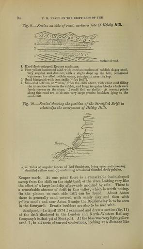 | Keywords: The Quarterly journal of the Geological Society of London (13204675073).jpg 94 T M BEADE ON THE DRIFT-BEDS OE THE <br> Pig 9 Section on side of road northern face of Helsby Hill <br> Surface of road <br> 1 Hard flesh-coloured Keuper sandstone <br> 2 Fine yellow laminated sand with interlaminations of reddish clayey sand <br> very regular and distinct with a slight slope up the hill ; occasional <br> waterworn travelled pebbles occur principally near the top <br> 3 Sand blackened with iron oxide fox-bed <br> 4 Subaerial detritus or talus from the cliffs above witb white sand filling <br> the interstices between the rubble and large irregular blocks which were <br> freely strewn on the slope I could find no shells At several points <br> along this road are to be seen very large granite boulders lying in the <br> sand-drift <br> Pig 10 Section showing the position of the Stratified Drift in <br> relation o the escarpment of Helsby Hills <br> a b Talus of angular blocks of Eed Sandstone lying upon and covering <br> stratified yellow sand c containing occasional rounded drift-pebbles <br> Keuper marls At one point there is a remarkable basin-shaped <br> sweep from the cliffs on the right bank of the river looking very like <br> the effect of a large landslip afterwards modified by rain There is <br> a remarkable absence of drift in this valley which is worth noting <br> On the plateau on each side drift can be found About Aston <br> there is generally sand covered with sandy clay and then with <br> yellow sand and near Aston Grange the Boulder-clay is to be seen <br> in the farmyard Erratic boulders are also to be met with <br> Stockport la April 1874 I examined and drew a section fig 11 <br> of the drift disclosed in the London and North-Western Kailway <br> Company's ballast-pit at Stockport At the base was very light yellow <br> sand 1 in all sorts of curved contortions looking at a distance like 36928675 113681 51125 Page 94 Text 39 http //www biodiversitylibrary org/page/36928675 1883 Geological Society of London Biodiversity Heritage Library The Quarterly journal of the Geological Society of London v 39 1883 Geology Periodicals Smithsonian Libraries bhl page 36928675 dc identifier http //biodiversitylibrary org/page/36928675 smithsonian libraries Information field Flickr posted date ISOdate 2014-03-16 Check categories 2015 August 26 CC-BY-2 0 BioDivLibrary https //flickr com/photos/61021753 N02/13204675073 2015-08-26 13 50 30 cc-by-2 0 PD-old-70-1923 The Quarterly journal of the Geological Society of London 1883 Photos uploaded from Flickr by FĂŚ using a script |