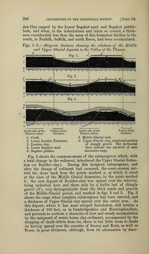 | Keywords: The Quarterly journal of the Geological Society of London (13071167613).jpg 396 <br> PROCEEDINGS OF THE GEOLOGICAL SOCIETY June 19 <br> don Clay capped by tlie Lower Bagshot sand and Bagshot pebble- <br> beds and when in tbe indentations and inlets so eroded a thick- <br> ness considerably less than the mass of this formation further to the <br> north in Norfolk Suffolk and north Essex had been accumulated <br> Pigs 1-3 ” Diagram Sections showing the relations of the Middle <br> and Upjper Glacial deposits to the Valley of the Thames <br> Valley of the <br> Chelmer <br> Nortli side of the Valley of the <br> Thames valley Chelmer <br> 5 Middle Glacial beds <br> 6 Upper Glacial clay occasional patches <br> of shingly gravel The horizontal <br> lines indicate the sea-level of each <br> successive stage <br> North side of the <br> Thames yalley <br> 1 Chalk <br> 2 Lower London Tertiaries <br> 3 London clay <br> 4 Lower Bagshot sand <br> 4' Bagshot pebbles <br> Fig 2 shows the commencement of the submergence which with <br> a total change in the sediment introduced the Upper Glacial forma- <br> tion or Boulder-clay During this incipient submergence and <br> after the change of sediment had occurred the coast-erosion car- <br> ried the shore back from the points marked a at which it stood <br> at the close of the Middle Glacial formation to the point marked <br> h ; the new deposit of Boulder- clay was spread over the interval <br> being underlain here and there only by a feeble bed of shingly <br> gravel 6' very distinguishable from the thick sands and gravels <br> of the Middle Glacial period and marked in figs 2 and 3 Fig 3 <br> shows the stage when complete submergence had been etiected and <br> a thickness of Upper Glacial clay spread over the entire area As <br> this deposit where it has most escaped denudation still retains a <br> thickness of 160 feet as in Cambridgeshire and Huntingdonshire <br> and presents so uniform a character of slow and steady accumulation <br> by the outspread of water-borne clay- sediment accompanied by the <br> dropping of chalk-debris from ice there is but little room to doubt <br> its having spread over the counties of Surrey and Kent as weU as <br> Essex in great thickness although from its attenuation by denu- 36345151 112028 51125 Page 396 Text v 23 http //www biodiversitylibrary org/page/36345151 1867 Geological Society of London Biodiversity Heritage Library The Quarterly journal of the Geological Society of London v 23 1867 Geology Periodicals Smithsonian Libraries bhl page 36345151 dc identifier http //biodiversitylibrary org/page/36345151 smithsonian libraries Information field Flickr posted date ISOdate 2014-03-10 Check categories 2015 August 26 CC-BY-2 0 BioDivLibrary https //flickr com/photos/61021753 N02/13071167613 2015-08-26 13 52 46 cc-by-2 0 PD-old-70-1923 The Quarterly journal of the Geological Society of London 1867 Photos uploaded from Flickr by Fæ using a script |
