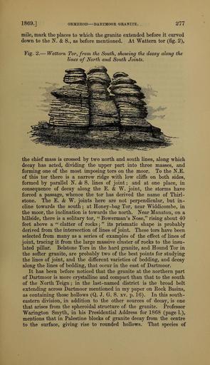 Keywords: The Quarterly journal of the Geological Society of London (12961600944).jpg 1869 ORiLEROD ” DAETMOOK GRANITE 277 <br> mile mark the places to which the granite extended before it curved <br> down to the N S as before mentioned At Wattern tor fig 2 <br> Fig 2 ” Wattern Tor from the South showing the decay along the <br> lines of North and South Joints <br> the chief mass is crossed by two north and south lines along which <br> decay has acted dividing the upper part into three masses and <br> forming one of the most imposing tors on the moor To the N E <br> of this tor there is a narrow ridge with low cliffs on both sides <br> formed by parallel N S lines of joint ; and at one place in <br> consequence of decay along the E W joint the storms have <br> forced a passage whence the tor has derived the name of Thirl- <br> stone The E W joints here are not perpendicular but in- <br> cline towards the south ; at Honey-bag Tor near Widdicombe in <br> the moor the inclination is towards the north Near Manaton on a <br> hillside there is a solitary tor Bowerman's Nose rising about 40 <br> feet above a clatter of rocks ; its prismatic shape is probably <br> derived from the intersection of lines of joint These tors have been <br> selected from many as a series of examples of the effect of lines of <br> joint tracing it from the large massive cluster of rocks to the insu- <br> lated pillar Belstone Tors in the hard granite and Hound Tor in <br> the softer granite are probably two of the best points for studying <br> the hues of joint and the different varieties of bedding and decay <br> along the lines of bedding that occur in the east of Dartmoor <br> It has been before noticed that the granite at the northern part <br> of Dartmoor is more crystalline and compact than that to the south <br> of the North Teign ; in the last-named district is the broad belt <br> extending across Dartmoor mentioned in my paper on Rock Basins <br> as containing those hollows Q J G S xv p 16 In this south- <br> eastern division in addition to the other sources of decay is one <br> that arises from the spheroidal structure of the granite Professor <br> Warington Smyth in his Presidential Address for 1868 page 1 <br> mentions that in Palestine blocks of granite decay from the centre <br> to the surface giving rise to rounded hollows That species of 36103124 111288 51125 Page 277 Text v 25 http //www biodiversitylibrary org/page/36103124 1869 Geological Society of London NameFound S xv Biodiversity Heritage Library The Quarterly journal of the Geological Society of London v 25 1869 Geology Periodicals Smithsonian Libraries bhl page 36103124 dc identifier http //biodiversitylibrary org/page/36103124 smithsonian libraries Information field Flickr posted date ISOdate 2014-03-06 Check categories 2015 August 26 CC-BY-2 0 BioDivLibrary https //flickr com/photos/61021753 N02/12961600944 2015-08-26 15 53 46 cc-by-2 0 PD-old-70-1923 The Quarterly journal of the Geological Society of London 1869 Photos uploaded from Flickr by FĂŚ using a script