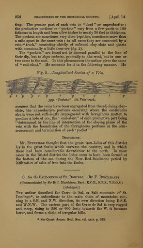 | Keywords: The Quarterly journal of the Geological Society of London (12961161455).jpg 256 <br> PROCEEDIlfGS OF THE GEOLOGICAL SOCIETY April 14 <br> ting The greater part of each vein is dead or unproductive ; <br> the productive portions or pockets vary from a few yards to 100 <br> fathoms in length and from a few inches to nearly 30 feet in thickness <br> The pockets are sometimes very close together sometimes more than <br> a mile apart in the same vein ; in all cases they are connected hy a <br> vein- track consisting chiefly of softened clay-slate and quartz <br> with occasionally a little iron-ore fig 2 <br> The pockets are found not to descend parallel to the line of <br> their dip but to slope endwise generally to the west but in one or <br> two cases to the east To this phenomenon the author gives the name <br> of end-slant He accounts for it in the following manner He <br> Fig 2 ” Longitudinal Section of a Vein <br> P i 'P <br> P <br> V t P t V <br> ppp Pockets ttt Vein-track <br> P <br> assumes that the veins have been segregated from the adjoining clay- <br> slate the unproductive portions occurring where the continuous <br> strata were not sufficiently impregnated with ferruginous matter to <br> produce a lode of ore the end-slant of each productive part being <br> determined by the line of intersection of the sloping plane of the <br> vein with the boundaries of the ferruginous portions at the com- <br> mencement and termination of each pocket ' <br> Discussion <br> Mr Etheeidge thought that the great iron-lodes of this district <br> lay in the great faults which traverse the country and in which <br> there had been considerable downthrow to the north In most <br> cases in the Bristol district the lodes seem to have been formed at <br> the bottom of the sea during the New-Red-Sandstone period by <br> infiltration of salts of iron into the faults <br> 3 On the Salt-mines of St Domingo By F Rttschhaupt <br> Communicated by Sir R I Murchison Bart K C B F E S Y P G S <br> Abridged <br> The author described the Cerro de Sal or Salt-mountain of St <br> Domingo as subordinate to the main chain of mountains run- <br> ning in a S E and N W direction its own direction being E S E <br> and W N W The eastern part of the Cerro de Sal is very rugged <br> and steep rising to 550 or 600 feet; towards the W it becomes <br> lower and forms a chain of irregular hills <br> See Quart Journ Geol Soc vol xxiv p 335 36103103 111288 51125 Page 256 Text v 25 http //www biodiversitylibrary org/page/36103103 1869 Geological Society of London Biodiversity Heritage Library The Quarterly journal of the Geological Society of London v 25 1869 Geology Periodicals Smithsonian Libraries bhl page 36103103 dc identifier http //biodiversitylibrary org/page/36103103 smithsonian libraries Information field Flickr posted date ISOdate 2014-03-06 Check categories 2015 August 26 CC-BY-2 0 BioDivLibrary https //flickr com/photos/61021753 N02/12961161455 2015-08-26 15 51 40 cc-by-2 0 PD-old-70-1923 The Quarterly journal of the Geological Society of London 1869 Photos uploaded from Flickr by Fæ using a script |
