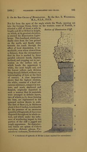 | Keywords: The Quarterly journal of the Geological Society of London (12961280663).jpg 1869 <br> WILTSHIRE HUNSTANTON EED CHALK <br> 185 <br> 2 On the Ued Chalk of Hunstanton By the Rev T Wiltshire <br> M A FX S F G S <br> Not far from the apex of the angle which the Wash opening out <br> into the German Ocean forms on the western coast of Norfolk is <br> situated a cliff of about a mile in rr m - <br> 1 i J rr / A i i- ˘ V ˘ u - Section of Hunstanton L lilt <br> length and 50 or 60 feet m height ™¦' <br> on which at its greatest elevation <br> is erected the Hunstanton Light- <br> house This headland which gra- <br> dually rises from the low ground <br> on the north and finally sinks <br> towards the south through the <br> effect of local denudation is re- <br> markable even when viewed from <br> a distance from the circumstance <br> that its face is marked by three <br> parallel coloured bands slightly <br> inclined and cropping out in suc- <br> cession on the surface soil of <br> which bands the uppermost is <br> white the next bright red and <br> the lowest yellow each division <br> being sharply defined mthout any <br> intermingling of tints at the lines <br> of contact A close inspection <br> shows that the highest stratum <br> the white consists of a hard cal- <br> careous substance compact in tex- <br> ture and much shattered and <br> fissured originally deposited in <br> such a manner that its materials <br> were arranged in definite layers <br> two of which a 6 those forming <br> the base are represented in the <br> annexed section drawn to scale <br> The first of these a in thickness <br> about 2 feet 6 inches is noticeable <br> for the presence of an enormous <br> quantity of fragments of Inocerami <br> dispersed throughout its whole ex- <br> tent and which under the influ- <br> ence of weathering impart to this <br> portion of the cliff a jagged and <br> rough appearance Its character- <br> istic fossils are spines of Cidaris <br> vesiculosa Holaster planus Ver- <br> micularia umbonata Terehratulina <br> A thickness of upwards of 30 feet is here omitted for convenience 36103030 111288 51125 Page 185 Text v 25 http //www biodiversitylibrary org/page/36103030 1869 Geological Society of London NameFound Cidaris vesiculosa NameConfirmed Cidaris vesiculosa NameFound Holaster planus NameConfirmed Holaster planus NameFound Terehratulina Biodiversity Heritage Library The Quarterly journal of the Geological Society of London v 25 1869 Geology Periodicals Smithsonian Libraries bhl page 36103030 dc identifier http //biodiversitylibrary org/page/36103030 smithsonian libraries Information field Flickr posted date ISOdate 2014-03-06 Check categories 2015 August 26 CC-BY-2 0 BioDivLibrary https //flickr com/photos/61021753 N02/12961280663 2015-08-26 15 54 16 cc-by-2 0 PD-old-70-1923 The Quarterly journal of the Geological Society of London 1869 Photos uploaded from Flickr by Fæ using a script |