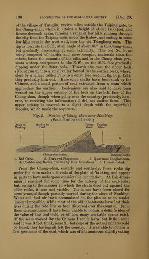 | Keywords: The Quarterly journal of the Geological Society of London (12961112575).jpg 130 <br> PROCEEDJNGS OF THE GEOLOGICAL SOCIETY DeC 23 <br> of the village of Tungiiu twelve miles outside the Taiping gate to <br> the Chung-shan where it attains a height of about 1700 feet and <br> thence descends again forming a range of low hills running through <br> the city from the Taiping-men under the Kulow and ending in some <br> low hiUs outside the west wall near the old Tsingliang-men The <br> dip is towards the S E at an angle of about 30° in the Chung-shan <br> but gradually decreasing at each extremity The bed No 3 as <br> being composed of harder and more compact materials than the <br> others forms the summits of the hills and in the Chung-shan pre- <br> sents a steep escarpment to the N W on the S E face gradually <br> dipping under the later beds Towards the east the upper beds <br> No 4 run up into a small valley formed in the earlier rocks where <br> close by a village called Pah-hwei-miau see section fig 3 p 124 <br> they gradually thin out Here some shafts have been sunk by the <br> Chinese and a small portion of coal extracted from a seam which <br> approaches the surface Coal-mines are also said to have been <br> worked on the upper outcrop of the beds on the S E face of the <br> Chung-shan though when going over the country previously how- <br> ever to receiving the information I did not notice them This <br> upper outcrop is covered to a slight depth with the superficial <br> deposits which mask the sequence <br> Fig 5 ” Section of Chung-slian near Nanking <br> Scale 4 miles to 1 inch <br> Plain of <br> Nanking <br> Said to be <br> Coal <br> Chung- <br> ehan <br> Taiping <br> Gate <br> Chung-shan series Tungting Eocka <br> 1 Red Grits 2 Dark-red Flagstones 3 Quartzose Conglomerate <br> 4 Coal-bearing Rocks overlain by later formations 5 Htematite-bed <br> From the Chung-shan easterly and southerly these rocks dip <br> under the more modern deposits of the plain of Nanking and appear <br> in parts to have undergone considerable denudation At Pah-hwei- <br> miau I searched for some time for the outcrop of the coal-beds; <br> but owing to the manner in which the strata died out against the <br> older rocks it was not visible The mines have been closed for <br> some years although partially worked during the siege of Nanking <br> Water and foul air have accumulated in the pits so as to render <br> descent impossible while most of the old inhabitants have lost their <br> lives during the rebellion or been dispersed over the country From <br> these circumstances I have been unable to obtain a definite idea of <br> the value of this coal-field or of how many workable seams exist <br> Of the seam worked by the Chinese I could learn but little some <br> said it was 3 feet thick some 8 ; but none of the actual miners could <br> be found they having all left the country I was able to obtain a <br> few specimens of the coal which was of a bituminous slightly caking 36102975 111288 51125 Page 130 Text v 25 http //www biodiversitylibrary org/page/36102975 1869 Geological Society of London Biodiversity Heritage Library The Quarterly journal of the Geological Society of London v 25 1869 Geology Periodicals Smithsonian Libraries bhl page 36102975 dc identifier http //biodiversitylibrary org/page/36102975 smithsonian libraries Information field Flickr posted date ISOdate 2014-03-06 Check categories 2015 August 26 CC-BY-2 0 BioDivLibrary https //flickr com/photos/61021753 N02/12961112575 2015-08-26 15 53 43 cc-by-2 0 PD-old-70-1923 The Quarterly journal of the Geological Society of London 1869 Photos uploaded from Flickr by Fæ using a script |