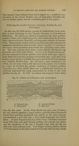 Keywords: The Quarterly journal of the Geological Society of London (12960188103).jpg OP THE N W MrDL iXD AND EASTERN COUNTIES <br> 183 <br> This deposit I have hitherto been led to regard as a southerly con- <br> tinuation of the Lower Boulder-clay of Lancashire Cheshire c <br> see my former paper and the concluding part of this paper <br> Drift- <br> around Nuneaton Coventry Kenilworth and <br> Leamington <br> In this area the drift-matrix consists of redistributed local shale <br> clay or marl belonging to the Triassic Permian or Carboniferous <br> formations The stones in addition to quartzose and other pebbles <br> consist of flints a few chalk fragments and erratics from the Pennine <br> hills Charnwood forest HartshiU and fragments or fossils of Jurassic <br> rocks These erratics which chieiiy came from the north and east are <br> commonly imbedded in what is locally called top clay of a brown or <br> red colour which graduates downwards into underlying marl shale <br> c This clay contains chalk flints rather fitfully distributed but <br> generally very little chalk debris In one of the Kenilworth gravel- <br> pits the redeposited Triassic pebbles intermixed with large angnlar <br> chalk flints and coal-dust graduate downwards into a pell-mell local <br> boulder-loam which is probably the equivalent of the Wolverhampton <br> and Stafl'ord Boulder-clay t Lillington near Leamington in <br> 1865 the red marl with a few stones near its surface was overlain <br> by a mass of stratified fine gravel consisting of Triassic pebbles <br> Gn/phites c above which there was a considerable thickness of <br> obliquely laminated fine sand surmounted by 2 feet of clay with <br> pebbles see fig 2 In 1878 no section was exposed lower down <br> Fig 2 ” Section at Lillington near Leamington <br> A Compact clay <br> C Fine gravel <br> B Laminated Sand <br> D Eed marl <br> than the fine sand At the Stoke-Heath clay-pits near Coventry <br> the clay which contained a large boulder probably from Charnwood <br> forest here and there graduated into gravel on the same horizon <br> and contained a few but only a few chalk-f -agments and chalk- <br> flints Around Nuneaton the clay with trap boulders contained <br> many flint chips and small Triassic pebbles but scarcely any chalk; <br> and the specimens of the clay I brought away with me did not <br> efi'crvesce with ordinary tests Xear Ilugby railway-station March <br> 1870 the matrix of the drift seemed to be locally derived clay chiefly 36090526 111264 51125 Page 183 Text 36 http //www biodiversitylibrary org/page/36090526 1880 Geological Society of London Biodiversity Heritage Library The Quarterly journal of the Geological Society of London v 36 1880 Geology Periodicals Smithsonian Libraries bhl page 36090526 dc identifier http //biodiversitylibrary org/page/36090526 smithsonian libraries Information field Flickr posted date ISOdate 2014-03-06 Check categories 2015 August 26 CC-BY-2 0 BioDivLibrary https //flickr com/photos/61021753 N02/12960188103 2015-08-26 16 56 23 cc-by-2 0 PD-old-70-1923 The Quarterly journal of the Geological Society of London 1880 Photos uploaded from Flickr by Fæ using a script |