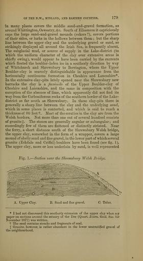 | Keywords: The Quarterly journal of the Geological Society of London (12960183603).jpg OP THE N W MIDL Vl D AND EASTERN COUN'TIES l79 <br> in many places covers the middle sand-and-gravel formation as <br> around Whittington Oswestry c South of Ellcsmere it capriciously <br> caps the large sand-and-gravel mounds eskers covers portions <br> of their sides or lurks in the hollows between them ; but the sharp <br> line between the npper clay and the underlying gravel or sand so <br> strikingly displayed all around the Irish Sea is frequently absent <br> The subglacial mud or source of supply in the Lake-district to <br> which the uniform character of the clay over extensive areas is <br> chiefly owing would appear to have been carried by the currents <br> which floated the boulder- laden ice in a southerly direction by way <br> of Whitchurch and Shrewsbury to Berrington where the Upper <br> Boulder-clay is scarcely distinguishable in appearance from the <br> horizontally continuous formation in Cheshire and Lancashire <br> In the extensive clay-pits lately opened near the Shrewsbury new <br> barracks the clay is a facsimile of the Upper Boulder-clay of <br> Cheshire and Lancashire and the same in composition with the <br> exception of the absence of lime which apparently did not fi nd its <br> way from the Carboniferous rocks of the southern border of the Lake- <br> district so far south as Shrewsbury In these claj'-pits there is <br> generally a sharp line between the clay and the underlying sand <br> which in some places is contorted and which is said to reach a <br> thickness of 90 feetf Most of the erratics in the clay are from the <br> Welsh borders Not more than one out of several hundred consists <br> of granite J The stones are generally angular or sub angular ; and <br> exceedingly few of them are flattened or distinctly striated jN'ear <br> the ferry a short distance south of the Shrewsbury Welsh bridge <br> the upper clay somewhat in the form of a wrapper covers a large <br> mound of shelly sand and fine gravel in the lower part of which several <br> granite Eskdale and Criffel boulders have been found see fig 1 <br> The upper clay more or less underlain by sand is well represented <br> Fig 1 ” Section near tJie Shrewsbury Welsh Bridge <br> A Upper Clay B Sand and fine grayel C Talus <br> I had not discovered this southerly extension of the upper clay when my <br> paper on sections around the estuary of the Dee Quart Juurn Geol Soc for <br> Kovember 1877 was -written <br> t The sand contains streaks and fragments of coal <br> \ Granite however is rather abundant in the lower unstratified gravel of <br> the neighbourhood 36090522 111264 51125 Page 179 Text 36 http //www biodiversitylibrary org/page/36090522 1880 Geological Society of London Biodiversity Heritage Library The Quarterly journal of the Geological Society of London v 36 1880 Geology Periodicals Smithsonian Libraries bhl page 36090522 dc identifier http //biodiversitylibrary org/page/36090522 smithsonian libraries Information field Flickr posted date ISOdate 2014-03-06 Check categories 2015 August 26 CC-BY-2 0 BioDivLibrary https //flickr com/photos/61021753 N02/12960183603 2015-08-26 16 53 07 cc-by-2 0 PD-old-70-1923 The Quarterly journal of the Geological Society of London 1880 Photos uploaded from Flickr by Fæ using a script |
