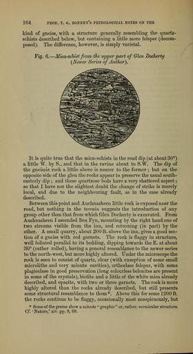| Keywords: The Quarterly journal of the Geological Society of London (12960448604).jpg 104 PEOF T G bonnet's PETEOLOGICAL NOTES ON THE <br> kind of gneiss with a structure generally resembling the quartz- <br> schists described below but containing a little more felspar decom- <br> posed The difference however is simply varietal <br> Fig 6 ” Mica-scTiist from the wpper part of Glen Doeherty <br> Newer Series of Author <br> It is quite true that the mica-schists in the road dip at about 30° <br> a little W by S and that in the ravine about to S W The dip of <br> the gneissic rock a little above is nearer to the former ; but on the <br> opposite side of the glen the rocks appear to preserve the usual south- <br> easterly dip ; and these quartzose beds have a very shattered aspect ; <br> so that I have not the slightest doubt the change of strike is merely <br> local and due to the neighbouring fault as in the case already <br> described <br> Between this point and Auchnasheen little rock is exposed near the <br> road but nothing in the terrain suggests the introduction of any <br> group other than that from which Glen Docherty is excavated From <br> Auchnasheen I ascended Ben Fyn mounting by the right hand one of <br> two streams visible from the inn and returning in part by the <br> other A small quarry about 200 ft above the inn gives a good sec- <br> tion of a gneiss with red garnets The rock is flaggy in structure <br> well foliated parallel to its bedding dipping towards the E at about <br> 30° rather rolled having a general resemblance to the newer series <br> to the north-west but more highly altered Under the microscope the <br> rock is seen to consist of quartz clear with exception of some small <br> microliths and very minute cavities orthoclase felspar with some <br> plagioclase in good preservation long colourless belonites are present <br> in some of the crystals biotite and a little of the white mica already <br> described and opacite with two or three garnets The rock is more <br> highly altered than the rocks already described but stiU presents <br> some structural resemblance to them Above this for some 1200 ft <br> the rocks continue to be flaggy occasionally most conspicuously but <br> Some of the grains show a minute graphic or rather vermicular structure <br> Cf ' Nature ' xiv pp 8 68 36090439 111264 51125 Page 104 Text 36 http //www biodiversitylibrary org/page/36090439 1880 Geological Society of London Biodiversity Heritage Library The Quarterly journal of the Geological Society of London v 36 1880 Geology Periodicals Smithsonian Libraries bhl page 36090439 dc identifier http //biodiversitylibrary org/page/36090439 smithsonian libraries Information field Flickr posted date ISOdate 2014-03-06 Check categories 2015 August 26 CC-BY-2 0 BioDivLibrary https //flickr com/photos/61021753 N02/12960448604 2015-08-26 16 56 30 cc-by-2 0 PD-old-70-1923 The Quarterly journal of the Geological Society of London 1880 Photos uploaded from Flickr by Fæ using a script |