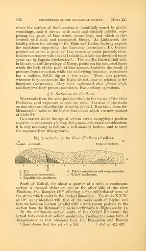 | Keywords: The Quarterly journal of the Geological Society of London (12895139683).jpg 432 <br> PKOCEEDINGS OF THE GEOLOGICAL SOCIETY June 22 <br> where the surface of the limestone is beautifully scored by glacial <br> scratchings and is strewn with sand and striated pebbles sup- <br> porting the patch of Lias which occurs here and which is also <br> covered with sand and transported blocks At Linkswood the <br> locality where the cutting in the Elgin and Rothes Railway exposes <br> the sandstone supporting the limestone cornstone Dr Gordon <br> pointed out to me a patch of Lias occurring under precisely iden- <br> tical circumstances with that at Linksfield which was described many <br> j ears ago by Captain Brickenden The late Mr Patrick Duff also <br> in his account of the geology of Moray points out the contorted forms <br> which the beds of this patch of Lias assume doubtless the result of <br> pressure from ice-action while the underlying limestone cornstone <br> has a uniform S S E dip at a low angle These Lias patches <br> wherever they are seen in the Elgin district bear no relation to the <br> limestone cornstone They have underneath them glacial drift <br> and they owe their present position to Post-tertiary operations <br> § 3 Section on the Findhorn <br> Westwards from the area just described in the course of the river <br> Findhorn good exposures of rock are seen Portions of the strata <br> on this river are described in detail by Sir R I Murchi son from the <br> Metamorphic rocks to the higher limestones which are now worked <br> at Cothallt <br> In a matter where the age of certain strata occupying a position <br> superior to sandstones yielding Holoptychius is under consideration <br> it is only necessary to indicate a well-marked horizon and to trace <br> the sequence from this upwards <br> s <br> Fig 2 <br> Raraplet b Cothall <br> -Section on the River Findhorn 2 miles <br> Bridge of Findhorn <br> a Till <br> b Limestone cornstone <br> c Reptiliferous sandstone <br> d Pebbly sandstones and conglomerates <br> e Yellow sandstones <br> South of Cothall for about a quarter of a mile a continuous <br> section is exposed either on one or the other side of the river <br> Findhorn the Ramplet Cliff affording a fine exhibition of some of <br> the strata which underlie the Cothall limestone The dip is N N W <br> at 10° being identical with that of the rocks south of Elgin ; and <br> here we have an horizon parallel with a well-known position in the <br> section from the Metamorphic rocks northwards to Elgin see fig 1 <br> In the continuous section south of the Cothall limestone the <br> lowest beds consist of yellow sandstones yielding the same form of <br> Holoptychius as that obtained from the Pluscarden and Bishops <br> Quart Journ Geol Soc vol vii p 289 t Ibid pp 422 423 36089701 111261 51125 Page 432 Text v 20 http //www biodiversitylibrary org/page/36089701 1864 Geological Society of London NameFound Holoptychius NameConfirmed Holoptychius EOLID 13307203 NameBankID 4196914 Biodiversity Heritage Library The Quarterly journal of the Geological Society of London v 20 1864 Geology Periodicals Smithsonian Libraries bhl page 36089701 dc identifier http //biodiversitylibrary org/page/36089701 smithsonian libraries Information field Flickr posted date ISOdate 2014-03-03 Check categories 2015 August 26 CC-BY-2 0 BioDivLibrary https //flickr com/photos/61021753 N02/12895139683 2015-08-26 16 51 22 cc-by-2 0 PD-old-70-1923 The Quarterly journal of the Geological Society of London 1864 Photos uploaded from Flickr by Fæ using a script |