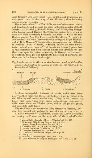 | Keywords: The Quarterly journal of the Geological Society of London (12894903095).jpg 200 <br> PROCEEDINGS OF THE GEOLOGICAL SOCIETY Mar 9 <br> New Mexico over large spaces ; also in Texas and Tennessee and <br> over great tracts in the valley of the Missouri ; thus indicating <br> several extensive blanks <br> The Craie tuffeau in Westphalia covers Carboniferous schists <br> and limestone f and we have the same in the Don country of South <br> Russia At Harwich J Kentish Town § and Calais deep borings <br> after having passed through the Cretaceous series have struck at <br> once into rocks apparently Palaeozoic and which at Calais are true <br> Coal-measures Near Seu d'Urgel on the River Segra N Spain M <br> Noblemaire met with Cretaceous rocks resting on Upper Silurian ; <br> and M Delia Marmora describes them as reposing on Lower Silurian <br> in Sardinia Parts of Scania in Sweden exhibit the same kind of <br> facts At and about Segovia at Cerada and Lozoya Spain beds <br> of this formation rest upon ancient schists and granite ; we find <br> them also upon the latter extensively in Saxony in Sweden ft <br> in Southern India i and Hippurite limestone at Tavolara and <br> elsewhere in South-west Sardinia §§ <br> Fig 5 ” Section in the Sierra de Guadarrama south of Cabanillas <br> showing Chalk resting on Granite of unknown age after MM de <br> Yerneuil and Collomb <br> S N <br> Sierra de <br> El Molar Atalaya Cabanillas Guadarrama <br> a Granite <br> b Chalk <br> c Diluvium <br> In these twenty-eight instances of blanks which were taken <br> nearly as they came the Cretaceous beds are found in contact with <br> the following rocks once sea-bottoms They lie on Jurassic six <br> times Lias once Trias four times Carboniferous Limestone or <br> schist seven times on Silurian twice and on old granite gneiss <br> and mica- slate eight times <br> Why the Chalk is not recorded as lying directly on Permian Devo- <br> nian fcc I cannot tell ; perhaps for want of a more extensive search <br> b Upper Greensand ” Neocomian Gault and Lower Greensand <br> are missing in Prance on the west side of the Anglo-Parisian <br> ' James Hall ' Boundary Report of Mexico ' vol i p 117 <br> t D'Archiac ' Histoire des Progres ' vol v p 224 <br> I Austen Quart Journ Geol Soc vol xii p 41 <br> § Prestwich ibid vol xii p 6 vol xiv p 249 <br> Annales des Mines 5 e serie vol xiv p 52 <br> Voyage en Sardaigne vol i p 414 <br> D'Archiac 'Histoire des Progres ' vol v p 49 <br> tt Ibid p 251 <br> J Blanford ' Palaeontologia Indica ' vol i p v <br> §§ Delia Marmora 'Voyage en Sardaigne ' Part 3 vol ii p 24 36089449 111261 51125 Page 206 Text v 20 http //www biodiversitylibrary org/page/36089449 1864 Geological Society of London NameFound Atalaya NameConfirmed Atalaya EOLID 5629706 NameBankID 1839678 NameFound Devo NameConfirmed Devo EOLID 4254131 NameBankID 4625395 NameFound Indica NameConfirmed Indica NameBankID 4432528 Biodiversity Heritage Library The Quarterly journal of the Geological Society of London v 20 1864 Geology Periodicals Smithsonian Libraries bhl page 36089449 dc identifier http //biodiversitylibrary org/page/36089449 smithsonian libraries Information field Flickr posted date ISOdate 2014-03-03 Check categories 2015 August 26 CC-BY-2 0 BioDivLibrary https //flickr com/photos/61021753 N02/12894903095 2015-08-26 16 53 08 cc-by-2 0 PD-old-70-1923 The Quarterly journal of the Geological Society of London 1864 Photos uploaded from Flickr by Fæ using a script |