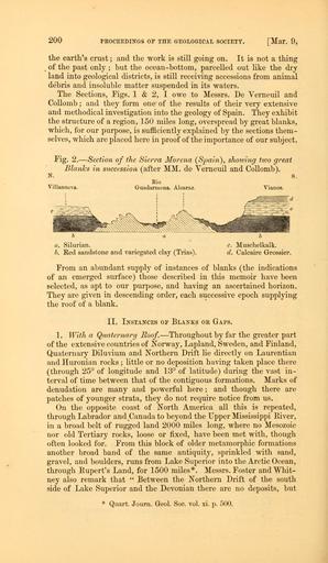 Keywords: The Quarterly journal of the Geological Society of London (12894997703).jpg 200 <br> PROCEEDINGS OF THE GEOLOGICAL SOCIETY Mar 9 <br> the earth's crust ; and the work is still going on It is not a thing <br> of the past only ; but the ocean-bottom parcelled out like the dry <br> land into geological districts is still receiving accessions from animal <br> debris and insoluble matter suspended in its waters <br> The Sections Figs 1 2 I owe to Messrs De Verneuil and <br> Collomb ; and they form one - of the results of their very extensive <br> and methodical investigation into the geology of Spain They exhibit <br> the structure of a region 150 miles long overspread by great blanks <br> which for our purpose is sufficiently explained by the sections them- <br> selves which are placed here in proof of the importance of our subject <br> Fig 2 ” Section of the Sierra Moreno Spain shoiving two great <br> Blanks in succession after MM de Verneuil and Collomb <br> N <br> Villanueva <br> Rio <br> Guadarmena Alcaraz <br> Vianos <br> a Silurian <br> b Red sandstone and variegated clay Trias <br> c Muschelkalk <br> d Calcaire Grossier <br> From an abundant supply of instances of blanks the indications <br> of an emerged surface those described in this memoir have been <br> selected as apt to our purpose and having an ascertained horizon <br> They are given in descending order each successive epoch supplying <br> the roof of a blank <br> II Instances of Blanks or Gaps <br> 1 With a Quaternary Roof ” Throughout by far the greater part <br> of the extensive countries of Norway Lapland Sweden and Finland <br> Quaternary Diluvium and Northern Drift lie directly on Laurentian <br> and Huronian rocks ; little or no deposition having taken place there <br> through 25° of longitude and 13° of latitude during the vast in- <br> terval of time between that of the contiguous formations Marks of <br> denudation are many and powerful here ; and though there are <br> patches of younger strata they do not require notice from us <br> On the opposite coast of North America all this is repeated <br> through Labrador and Canada to beyond the Upper Mississippi River <br> in a broad belt of rugged land 2000 miles long where no Mesozoic <br> nor old Tertiary rocks loose or fixed have been met with though <br> often looked for From this block of older metamorphic formations <br> another broad band of the same antiquity sprinkled with sand <br> gravel and boulders runs from Lake Superior into the Arctic Ocean <br> through Eupert's Land for 1500 miles Messrs Foster and Whit- <br> ney also remark that Between the Northern Drift of the south <br> side of Lake Superior and the Devonian there are no deposits but <br> Quart Journ Geol Soc vol xi p 500 36089443 111261 51125 Page 200 Text v 20 http //www biodiversitylibrary org/page/36089443 1864 Geological Society of London Biodiversity Heritage Library The Quarterly journal of the Geological Society of London v 20 1864 Geology Periodicals Smithsonian Libraries bhl page 36089443 dc identifier http //biodiversitylibrary org/page/36089443 smithsonian libraries Information field Flickr posted date ISOdate 2014-03-03 Check categories 2015 August 26 CC-BY-2 0 BioDivLibrary https //flickr com/photos/61021753 N02/12894997703 2015-08-26 16 58 04 cc-by-2 0 PD-old-70-1923 The Quarterly journal of the Geological Society of London 1864 Photos uploaded from Flickr by Fæ using a script |