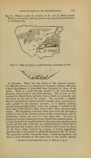 Keywords: The Quarterly journal of the Geological Society of London (14073282461).jpg ASSOCIATED KOCKS OF THE BREIDDEN HILLS <br> 541 <br> Fig 3 ” Fehpar-cnistal in andesite at N end of Moel-y-Golfa <br> 00 ft from summit showing fractarea of crystal a and inclitsion <br> of serjpentine b <br> Fig 4 ” -Edge of felspar crystal showing inclusions of base <br> v\ <br> «v AA <br> 2 Pyroxene There are two forms of this mineral present <br> a Rhombic pyroxene in octagonal or elongated sections indicating <br> a good development of pinacoidal faces truncated by those of the <br> prism There is a good cleavage parallel to the best-developed <br> pinacoid but no trace of any other cleavage The crystals are ter- <br> minated by oblique faces probably domes which are generally only <br> developed at one end of the crystal The structure is slightly <br> fibrous and there are curious lamellae of darker green mineral gene- <br> rally parallel to the principal pinacoid It is slightly dichroic <br> passing from greenish yellow when the cleavage is parallel to the <br> short axis of the nicol to light straw-yellow when placed at right <br> angles The maximum extinction takes place when the cleavage is <br> parallel to one of the vibration -planes of the crossed nicols and the <br> polarization colours are not of a very high order It occurs in <br> crystals of all sizes retaining its shape do'w n to the smallest prisms It <br> is best observed in its unaltered state in the great crags running round <br> the E and S E side of the hill at a vertical distance of from 300 to <br> 400 feet from the summit but in an altered state it occurs in almost <br> all the lavas being replaced by a green or brown serpentinous <br> pseudomorph in the manner so admirably figured by Mr W Cross <br> The serpentine needles frequently have a radial arrangement and <br> there is more alteration in the large than in the smaller crystals <br> Bulletin United States Geol Suit I 1885 pi ii fig 8 37047421 114009 51125 Page 541 Text 41 http //www biodiversitylibrary org/page/37047421 1885 Geological Society of London Biodiversity Heritage Library The Quarterly journal of the Geological Society of London v 41 1885 Geology Periodicals Smithsonian Libraries bhl page 37047421 dc identifier http //biodiversitylibrary org/page/37047421 smithsonian libraries Information field Flickr posted date ISOdate 2014-04-30 Check categories 2015 August 26 CC-BY-2 0 BioDivLibrary https //flickr com/photos/61021753 N02/14073282461 2015-08-26 04 55 18 cc-by-2 0 PD-old-70-1923 The Quarterly journal of the Geological Society of London 1885 Photos uploaded from Flickr by Fæ using a script