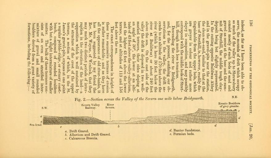 | Keywords: The Quarterly journal of the Geological Society of London (12894969463).jpg 136 <br> PROCEEDINGS OF THE GEOLOGICAL SOCIETY Jail 20 <br> indeed as far as I have been able to ob- <br> serve the mounds of drift which occupy <br> so much of the valley up to Shrewsbury <br> consist mostly of such beds of sand and <br> gravel as occur at the base and the sum- <br> mit of Strethill the middle tough clay- <br> deposit being but slightly represented <br> In the cutting opposite Build was Abbey <br> and in the gravel-pits near the station <br> the clean sea-sand similar to that at the <br> base of Strethill is however readily dis- <br> tinguishable from the upper beds which <br> are greyer in colour and rather more <br> clayey in composition and may possibly <br> correspond with the middle beds of Stret- <br> hill though much less tenacious <br> Descending the river to Bridgnorth <br> and for the present confining our ob- <br> servations to the valley the drift as- <br> cends to an altitude of 170 feet above the <br> river which is here 30 feet below the <br> river at Buildwas or about 240 feet <br> above the sea On the east side of the <br> valley the drift is disposed in two well- <br> marked terraces their sides sloping at <br> an angle of 30° the lower at an alti- <br> tude of 43 feet above the valley-alluvium <br> and the higher 43 feet above the lower <br> terrace and at altitudes of 113 and 156 <br> feet above the sea <br> The exact correspondence in height of <br> these two successive terraces of erosion <br> is rather remarkable ; and as they have <br> all the appearance of old river-banks it <br> has been suggested by my friend the <br> Rev Mr Wayne of Wenlock that they <br> may mark two distinct periods of inter- <br> ruption in the elevation of the land ” a <br> supposition which is well sustained by <br> the structure of the crest of the upper <br> terrace a section of which in the St <br> James's gravel-pits exposes at one point <br> a regular pebble-ridge or estuary coast- <br> beach composed of rounded boulders <br> with but a slight intermixture of smaller <br> matter The bulk of these terraces con- <br> sists of an even and stratified inter- <br> mixture of gravel and small rounded <br> boulders derived from a great variety of <br> formations including the following ” <br> o <br> r« <br> pq <br> 2Q <br> <br> <br> Q <br> CM <br> «Jg <br> rOH3 <br> 5 S <br> o <br> P a <br> S3 «C t 36089377 111261 51125 Page 136 Text v 20 http //www biodiversitylibrary org/page/36089377 1864 Geological Society of London Biodiversity Heritage Library The Quarterly journal of the Geological Society of London v 20 1864 Geology Periodicals Smithsonian Libraries bhl page 36089377 dc identifier http //biodiversitylibrary org/page/36089377 smithsonian libraries Information field Flickr posted date ISOdate 2014-03-03 Check categories 2015 August 26 CC-BY-2 0 BioDivLibrary https //flickr com/photos/61021753 N02/12894969463 2015-08-26 16 52 09 cc-by-2 0 PD-old-70-1923 The Quarterly journal of the Geological Society of London 1864 Photos uploaded from Flickr by Fæ using a script |