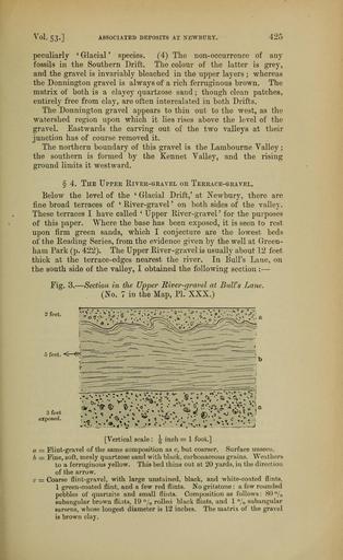 | Keywords: The Quarterly journal of the Geological Society of London (12894038054).jpg Vol 53 ASSOCIATED DEPOSITS AT NEWBURY 425 <br> peculiarly ' Glacial ' species 4 The non-occurrence of any <br> fossils in the Southern Drift The colour of the latter is grey <br> and the gravel is invariably bleached in the upper layers ; whereas <br> the Donnington gravel is always of a rich ferruginous brown The <br> matrix of both is a clayey quartzose sand ; though clean patches <br> entirely free from clay are often intercalated in both Drifts <br> The Donnington gravel appears to thin out to the west as the <br> watershed region upon which it lies rises above the level of the <br> gravel Eastwards the carving out of the two valleys at their <br> junction has of course removed it <br> The northern boundary of this gravel is the Lambourne Valley ; <br> the southern is formed by the Kennet Valley and the rising <br> ground limits it westward <br> § 4 The Upper Eiver-gravel or Terrace-gravel <br> Below the level of the ' Glacial Drift ' at Newbury there are <br> fine broad terraces of ' Eiver-gravel ' on both sides of the valley <br> These terraces I have called ' Upper Eiver-gravel' for the purposes <br> of this paper Where the base has been exposed it is seen to rest <br> upon firm green sands which I conjecture are the lowest beds <br> of the Eeading Series from the evidence given by the well at Green- <br> ham Park p 422 The Upper Eiver-gravel is usually about 12 feet <br> thick at the terrace-edges nearest the river In Bull's Lane on <br> the south side of the valley I obtained the following section ” <br> Pig 3 ” Section in the Upper River-gravel at Bull's Lane <br> No 7 in the Map PL XXX <br> 2 feet <br> 3 feet -« ¢ ¢ \ sC ' V - ' ‚¬ ' b l V~ <br> exposed ¢ / - w ž « -V ' – C V – - – j <br> Vertical scale -g- inch 1 foot <br> a Flint-gravel of the same composition as c but coarser Surface unseen <br> b Fine soft mealy quartzose sand with black carbonaceous grains Weathers <br> to a ferruginous yellow This bed thins out at 20 yards in the direction <br> of the arrow <br> c Coarse flint-gravel with large unstained black and white-coated flints <br> 1 green-coated flint and a few red flints No gritstone a few rounded <br> pebbles of quartzite and small flints Composition as follows 80 <br> subangular brown flints 19 °/ rolled black flints and 1 subangular <br> sarsens whose longest diameter is 12 inches The matrix of the gravel <br> is brown clay 36029248 111130 51125 Page 425 Text 53 http //www biodiversitylibrary org/page/36029248 1897 Geological Society of London Biodiversity Heritage Library The Quarterly journal of the Geological Society of London v 53 1897 Geology Periodicals Smithsonian Libraries bhl page 36029248 dc identifier http //biodiversitylibrary org/page/36029248 smithsonian libraries Information field Flickr posted date ISOdate 2014-03-03 Check categories 2015 August 26 CC-BY-2 0 BioDivLibrary https //flickr com/photos/61021753 N02/12894038054 2015-08-26 16 58 27 cc-by-2 0 PD-old-70-1923 The Quarterly journal of the Geological Society of London 1897 Photos uploaded from Flickr by Fæ using a script |