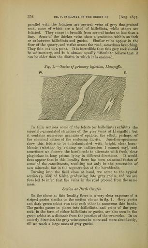 Keywords: The Quarterly journal of the Geological Society of London (12893678443).jpg 354 <br> DE C CALLAWAY ON THE OKIGLN OF <br> Aug 1897 <br> parallel with the foliation are several veins of grey fine-grained <br> rock some of which are a kind of halleflinta while others are <br> foliated They range in breadth from several inches to less than a <br> line Some of the thicker veins show a gradation within an inch <br> or so between halleflinta and gneiss Similar veins appear in the <br> floor of the quarry and strike across the road sometimes branching <br> They thin out to a point It is incredible that this grey rock should <br> be sedimentary and it is almost equally difficult to believe that it <br> can be older than the diorite in which it is enclosed <br> Fig 1 ” Gneiss of primary injection Llanyaffo <br> w - _______ E- <br> In thin sections some of the felsite or halleflinta exhibits the <br> minutely-granulated structure of the grey veins at Llangaffo ; but <br> it contains numerous granules of epidote the effect perhaps of <br> the chemical action of the enclosing diorite Junction-specimens <br> show this felsite to be interlaminated with bright clear horn- <br> blende whether by veining or infiltration I cannot say and <br> sometimes we observe the hornblende to alternate with fresh clear <br> plagioclase in long prisms lying in different directions It would <br> thus appear that in this locality there has been an actual fusion of <br> some of the constituents resulting not only in the generation of <br> new minerals but in the regeneration of the hornblende <br> Turning into the field close at hand we come to the typical <br> section p 356 of felsite graduating into grey gneiss and we are <br> thus led to infer that the veins in the road proceed from the same <br> Section at Forth Gwyfen <br> On the shore at this locality there is a very clear exposure of a <br> striped gneiss similar to the section shown in fig 1 Grey gneiss <br> and dark-green schist run into each other in numerous thin bands <br> The gneiss passes in places into halleflinta and veins of the grey <br> rock in the form of either halleflinta or gneiss are also seen in the <br> green schist at a distance from the junction of the two rocks In an <br> easterly direction the grey veins come in more and more abundantly <br> till we reach a large mass of grey gneiss 36029163 111130 51125 Page 354 Text 53 http //www biodiversitylibrary org/page/36029163 1897 Geological Society of London Biodiversity Heritage Library The Quarterly journal of the Geological Society of London v 53 1897 Geology Periodicals Smithsonian Libraries bhl page 36029163 dc identifier http //biodiversitylibrary org/page/36029163 smithsonian libraries Information field Flickr posted date ISOdate 2014-03-03 Check categories 2015 August 26 CC-BY-2 0 BioDivLibrary https //flickr com/photos/61021753 N02/12893678443 2015-08-26 17 53 50 cc-by-2 0 PD-old-70-1923 The Quarterly journal of the Geological Society of London 1897 Photos uploaded from Flickr by Fæ using a script |