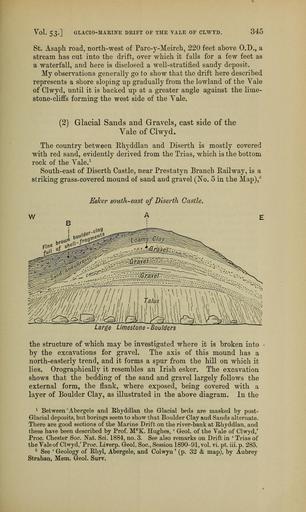 | Keywords: The Quarterly journal of the Geological Society of London (12893572175).jpg Vol 53- GLACIO-MARINE DRIFT OF THE YALE OF CLWYD <br> 345 <br> St Asaph road north-west of Parc-y-Meirch 220 feet above O D a <br> stream has cut into the drift over which it falls for a few feet as <br> a waterfall and here is disclosed a well-stratified sandy deposit <br> My observations generally go to show that the drift here described <br> represents a shore sloping up gradually from the lowland of the Vale <br> of Clwyd until it is backed up at a greater angle against the lime- <br> stone-cliffs forming the west side of the Vale <br> 2 Glacial Sands and Gravels east side of the <br> Vale of Clwyd <br> The country between Rhyddlan and Diserth is mostly covered <br> with red sand evidently derived from the Trias which is the bottom <br> rock of the Vale 1 <br> South-east of Diserth Castle near Prestatyn Branch Eailway is a <br> striking grass-covered mound of sand and gravel No 5 in the Map ' 2 <br> W <br> Esker south-east of Diserth Castle <br> A <br> I bou <br> bro <br> Large Limestone -Boulders <br> the structure of which may be investigated where it is broken into <br> by the excavations for gravel The axis of this mound has a <br> north-easterly trend and it forms a spur from the hill on which it <br> lies Orographically it resembles an Irish esker The excavation <br> shows that the bedding of the sand and gravel largely follows the <br> external form the flank where exposed being covered with a <br> layer of Boulder Clay as illustrated in the above diagram In the <br> 1 Between Abergele and Rhyddlan the Glacial beds are masked by post- <br> Glacial deposits but borings seem to show that Boulder Clay and Sands alternate <br> There are good sections of the Marine Drift on the river-bank at R-hyddlan and <br> these have been described by Prof M C K Hughes ' Geol of the Vale of Clwyd ' <br> Proc Chester Soc Nat Sci 1884 no 3 See also remarks on Drift in ' Trias of <br> the Yale of Clwyd ' Proc Liverp Geol Soc Session 1890-91 vol vi pt iii p 285 <br> 2 See ' Geology of Rhyl Abergele and Colwyn ' p 32 map by Aubrey <br> Strahan Mem Geol Surv 36029150 111130 51125 Page 345 Text 53 http //www biodiversitylibrary org/page/36029150 1897 Geological Society of London Biodiversity Heritage Library The Quarterly journal of the Geological Society of London v 53 1897 Geology Periodicals Smithsonian Libraries bhl page 36029150 dc identifier http //biodiversitylibrary org/page/36029150 smithsonian libraries Information field Flickr posted date ISOdate 2014-03-03 Check categories 2015 August 26 CC-BY-2 0 BioDivLibrary https //flickr com/photos/61021753 N02/12893572175 2015-08-26 17 51 28 cc-by-2 0 PD-old-70-1923 The Quarterly journal of the Geological Society of London 1897 Photos uploaded from Flickr by Fæ using a script |