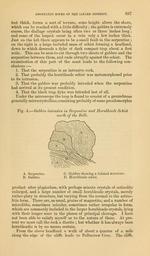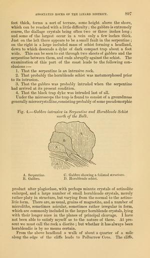 Keywords: The Quarterly journal of the Geological Society of London (12737030904).jpg ASSOCIATED ROCKS OF THE LIZARD DISTRICT <br> 897 <br> feet thick forms a sort of terrace some height above the shore <br> which can be reached with a little difficulty ; the gabbro is extremely <br> coarse the diallage crystals being often two or three inches long ; <br> and some of the largest occur in a vein only a few inches thick <br> Just on the left there appears to be a small fault in the serpentine ; <br> on the right is a large included mass of schist forming a headland <br> down to which descends a dyke of dark compact trap about a foot <br> wide This can be seen to cut through two sheets of gabbro and the <br> serpentine between them and ends abruptly against the schist The <br> examination of this part of the coast leads to the following con- <br> clusions ” <br> 1 That the serpentine is an intrusive rock <br> 2 That probably the hornblende schist was metamorphosed prior <br> to its intrusion <br> 3 That the gabbro was probably intruded when the serpentine <br> had arrived at its present condition <br> 4 That the black trap dyke was intruded last of all <br> Under the microscope the trap is found to consist of a groundmass <br> generally microcrystalline consisting probably of some pseudomorphic <br> Fig 4 ” Gabbro intrusive in Serpentine and Hornblende Schist <br> north of the Balk <br> A Serpentine <br> B Gabbro <br> C Gabbro showing a foliated structure <br> D Hornblende schist <br> product after plagioclase with perhaps minute crystals of actinolite <br> enlarged and a large number of small hornblende crystals merely <br> rather platy in structure but varying from the normal to the actino- <br> litic form There are as usual grains of magnetite and a number of <br> microliths sometimes acicular sometimes rather irregular in form <br> which are commonly included in the larger hornblende crystals lying <br> with their longer axes in the planes of principal cleavage I have <br> not been able to satisfy myself as to the nature of these At pre- <br> sent we must call the rock a diorite ; but whether it has always been <br> hornblendic is by no means certain <br> From the above headland a walk of about a quarter of a mile <br> along the edge of the cliffs leads to Polbarrow Cove The cliffs 35819092 110705 51125 Page 897 Text 33 http //www biodiversitylibrary org/page/35819092 1877 Geological Society of London Biodiversity Heritage Library The Quarterly journal of the Geological Society of London v 33 1877 Geology Periodicals Smithsonian Libraries bhl page 35819092 dc identifier http //biodiversitylibrary org/page/35819092 smithsonian libraries Information field Flickr posted date ISOdate 2014-02-24 Check categories 2015 August 26 CC-BY-2 0 BioDivLibrary https //flickr com/photos/61021753 N02/12737030904 2015-08-26 20 02 09 cc-by-2 0 PD-old-70-1923 The Quarterly journal of the Geological Society of London 1877 Photos uploaded from Flickr by Fæ using a script |