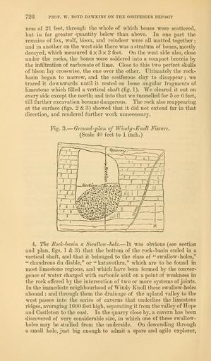 Keywords: The Quarterly journal of the Geological Society of London (12736581303).jpg 72G <br> rROF W BOYD DAWKINS ON TnE OSSIFEROUS DEPOSIT <br> ness of 21 feet through the whole of which bones were scattered <br> but in far greater quantity below than above In one part the <br> remains of fox wolf bison and reindeer were all matted together ; <br> and in another on the west side there was a stratum of bones mostly <br> decayed which measured 4x3x2 feet On the west side also close <br> under tho rocks the bones were soldered into a compact breccia by <br> the infiltration of carbonate of lime Close to this two perfect skulls <br> of bison lay crosswise the one over the other Ultimately the rock- <br> basin began to narrow and the ossiferous clay to disappear ; we <br> traced it downwards until it rested on loose angular fragments of <br> limestone which filled a vertical shaft fig 1 We cleared it out on <br> every side except the north; and into that we tunnelled for 5 or 6 feet <br> till further excavation became dangerous The rock also reappearing <br> at the surface figs 2 3 showed that it did not extend far in that <br> direction and rendered further work unnecessary <br> Fig 3 <br> – Ground-plan of Windy -Knoll Fissure <br> Scale 40 feet to 1 inch <br> 4 The Koch-basin a Sivalloiv-Jwle ” It was obvious see section <br> and plan figs 1 3 that tho bottom of the rock-basin ended in a <br> vertical shaft and that it belonged to the class of swallow -holes <br> chaudrons du diable or katavothra which are to be found in <br> most limestone regions and which have been formed by the conver- <br> gence of water charged with carbonic acid on a point of weakness in <br> the rock offered by the intersection of two or more systems of joints <br> In the immediate neighbourhood of Windy Knoll these swallow-holes <br> abound ; and through them the drainage of the upland valley to the <br> west passes into the series of caverns that underlies the limestone <br> ridges averaging 1600 feet high separating it from the valley of Hope <br> and Castlcton to the east In the quarry close by a cavern has been <br> discovered of very considerable size in which one of these swallow- <br> holes may be studied from the underside On descending through <br> a small hole just big enough to admit a spare and agile explorer 35818903 110705 51125 Page 726 Text 33 http //www biodiversitylibrary org/page/35818903 1877 Geological Society of London Biodiversity Heritage Library The Quarterly journal of the Geological Society of London v 33 1877 Geology Periodicals Smithsonian Libraries bhl page 35818903 dc identifier http //biodiversitylibrary org/page/35818903 smithsonian libraries Information field Flickr posted date ISOdate 2014-02-24 Check categories 2015 August 26 CC-BY-2 0 BioDivLibrary https //flickr com/photos/61021753 N02/12736581303 2015-08-26 19 55 05 cc-by-2 0 PD-old-70-1923 The Quarterly journal of the Geological Society of London 1877 Photos uploaded from Flickr by Fæ using a script |