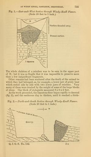 Keywords: The Quarterly journal of the Geological Society of London (12736411225).jpg AT WINDY KNOLL CASTLETON DERBYSHIRE <br> 725 <br> Fig 1 East-and- West Section through Windy-Knoll Fissure <br> Scale 20 feet to 1 inch <br> ' Surface denuded away <br> Present surface <br> y Cavern <br> 7 <br> The whole skeleton of a reindeer was to be seen in the upper part <br> of B ; but it was so fragile that it was impossible to preserve more <br> than a few insignificant fragments <br> Other remains had been scattered after the death of the animal to <br> which they had belonged as for example a lower jaw of grisly bear <br> which rested side by side with two lower jaws of reiudeer Very <br> many of them were crushed by the weight of some of the large blocks <br> of stone One block of stalagmite measured 8x6x2 feet <br> As the work proceeded the limestone floor began rapidly to descend <br> fig 2 and the ossiferous clay to thicken until it reached a thick- <br> Fig 2 North-and-South Section through Windy-Knoll Fissure <br> Scale 20 feet to 1 inch <br> Q J G S No 132 35818902 110705 51125 Page 725 Text 33 http //www biodiversitylibrary org/page/35818902 1877 Geological Society of London Biodiversity Heritage Library The Quarterly journal of the Geological Society of London v 33 1877 Geology Periodicals Smithsonian Libraries bhl page 35818902 dc identifier http //biodiversitylibrary org/page/35818902 smithsonian libraries Information field Flickr posted date ISOdate 2014-02-24 Check categories 2015 August 26 CC-BY-2 0 BioDivLibrary https //flickr com/photos/61021753 N02/12736411225 2015-08-26 19 58 10 cc-by-2 0 PD-old-70-1923 The Quarterly journal of the Geological Society of London 1877 Photos uploaded from Flickr by FĂŚ using a script |
