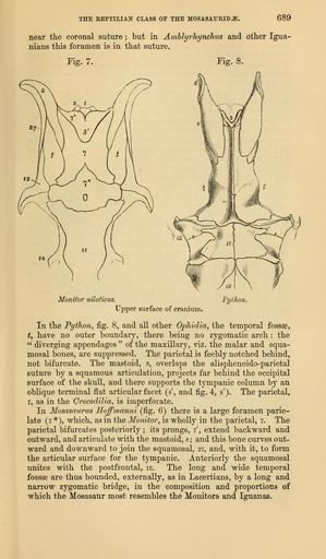 | Keywords: The Quarterly journal of the Geological Society of London (12736320215).jpg THE KEPTILIAN CLASS OF THE MOSASAURID <br> 689 <br> near the coronal suture ; but in Amblyrhynchus and other Igua- <br> nians this foramen is in that suture <br> Tig 7 <br> Fig 8 <br> Monitor niloticus <br> Upper surface of cranium <br> Python <br> In the Python fig 8 and all other Ophidia the temporal fossae <br> t y have no outer boundary there being no zygomatic arch the <br> diverging appendages of the maxillary viz the malar and squa- <br> mosal bones are suppressed The parietal is feebly notched behind <br> not bifurcate The mastoid 8 overlaps the alisphenoido-parietal <br> suture by a squamous articulation projects far behind the occipital <br> surface of the skull and there supports the tympanic column by an <br> oblique terminal flat articular facet s' and fig 4 s' The parietal <br> 7 as in the Crocodilia is imperforate <br> In Mosasaurus Hoffrnanni fig 6 there is a large foramen parie- <br> late 7 which as in the Monitor is wholly in the parietal 7 The <br> parietal bifurcates posteriorly ; its prongs 7' extend backward and <br> outward and articulate with the mastoid 8 ; and this bone curves out- <br> ward and downward to join the squamosal 27 and with it to form <br> the articular surface for the tympanic Anteriorly the squamosal <br> unites with the postfrontal 12 The long and wide temporal <br> fossae are thus bounded externally as in Lacertians by a long and <br> narrow zygomatic bridge in the composition and proportions of <br> which the Mosasaur most resembles the Monitors and Iguanas 35818866 110705 51125 Page 689 Text 33 http //www biodiversitylibrary org/page/35818866 1877 Geological Society of London NameFound Amblyrhynchus NameConfirmed Amblyrhynchus EOLID 35626 NameBankID 2536011 NameFound Crocodilia NameConfirmed Crocodilia EOLID 1739 NameBankID 582627 NameFound Igua NameConfirmed Igua NameBankID 4554062 NameFound Mosasaurus NameConfirmed Mosasaurus EOLID 4518635 NameBankID 4248162 Biodiversity Heritage Library The Quarterly journal of the Geological Society of London v 33 1877 Geology Periodicals Smithsonian Libraries bhl page 35818866 dc identifier http //biodiversitylibrary org/page/35818866 smithsonian libraries Information field Flickr posted date ISOdate 2014-02-24 CC-BY-2 0 BioDivLibrary https //flickr com/photos/61021753 N02/12736320215 2015-08-26 20 02 58 cc-by-2 0 PD-old-70-1923 The Quarterly journal of the Geological Society of London 1877 Photos uploaded from Flickr by Fæ using a script Varanus niloticus Python genus |