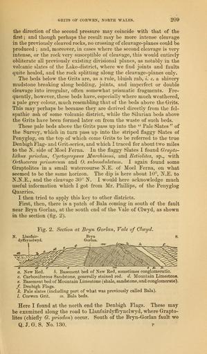 Keywords: The Quarterly journal of the Geological Society of London (12735780365).jpg GRITS OF CORWEN NORTH WALES <br> 209 <br> the direction of the second pressure may coincide with that of the <br> first ; and though perhaps the result may be more intense cleavage <br> in the previously cleaved rocks no crossing of cleavage-planes could be <br> produced ; and moreover in cases where the second cleavage is very <br> intense or the rock very susceptible of cleavage this would entirely <br> obliterate all previously existing divisional planes as notably in the <br> volcanic slates of the Lake-district where we find joints and faults <br> quite healed and the rock splitting along the cleavage-planes only <br> The beds below the Grits are as a rule bluish rab i e a shivery <br> mudstone breaking along bedding joints and imperfect or double <br> cleavage into irregular often somewhat prismatic fragments Fre- <br> quently however these beds have especiall - where much weathered <br> a pale grey colour much resembling that of the beds above the Grits <br> This may perhaps be because they are derived directly from the fel- <br> spathic ash of some volcanic district while the Silurian beds above <br> the Grits have been formed later on from the waste of such beds <br> These pale beds above the Grits pass up into the Pale Slates of <br> the Survey which in turn pass up into the striped flaggy Slates of <br> Penyglog on the top of which come Grits to be referred to the true <br> Denbigh Flag- and Grit-series and which I traced for about two miles <br> to the N side of Moel Ferna In the flaggy Slates I found Grapto- <br> lithus priodon Cyrtograpsus Murchisoni and JRetiolites sp with <br> Orthoceras pinmcevum and 0 subundulatum I again found some <br> Graptolites in a small watercourse N E of Moel Ferna on what <br> seemed to be the same horizon The dip is here about 10° ISLE to <br> N N E and the cleavage 30° N I would here acknowledge much <br> useful information which I got from Mr Phillips of the Penyglog <br> Quarries <br> I then tried to apply this key to other districts <br> First then there is a patch of Bala coming in south of the fault <br> near Bryn Gorlan at the south end of the Yale of Clwyd as shown <br> in the section fig 2 <br> Fig 2 Section at Bryn Gorlan Vale of Clwyd <br> N Llanfair- <br> dyffrynclwyd <br> i <br> Bryn <br> Gorlan <br> c ~ 7 e -f i tn Pit 7i- <br> a New Red b Basement bed of New Eed sometimes conglomeratic <br> c Carboniferous Sandstone generally stained red d Mountain Limestone <br> e Basement bed of Mountain Limestone shale sandstone and conglomerate <br> f Denbigh Flags <br> k Pale slates including part of what was previously called Bala <br> I Corwen Grit on Bala beds <br> Here I found at the north end the Denbigh Flags These may <br> be examined along the road to LlanfairdyfErynclwyd where Grapto- <br> lites chiefly G priodon occur South of the Bryn-Gorlan fault we <br> Q J G S No 130 p 35818328 110705 51125 Page 209 Text 33 http //www biodiversitylibrary org/page/35818328 1877 Geological Society of London NameFound Cyrtograpsus NameConfirmed Cyrtograpsus EOLID 4266530 NameBankID 4134941 NameFound Ferna NameConfirmed Ferna NameBankID 4459310 NameFound Graptolites NameConfirmed Graptolites NameBankID 423327 NameFound Graptolites priodon NameFound Orthoceras NameConfirmed Orthoceras EOLID 30106 NameBankID 1861424 Biodiversity Heritage Library The Quarterly journal of the Geological Society of London v 33 1877 Geology Periodicals Smithsonian Libraries bhl page 35818328 dc identifier http //biodiversitylibrary org/page/35818328 smithsonian libraries Information field Flickr posted date ISOdate 2014-02-24 Check categories 2015 August 26 CC-BY-2 0 BioDivLibrary https //flickr com/photos/61021753 N02/12735780365 2015-08-26 19 54 52 cc-by-2 0 PD-old-70-1923 The Quarterly journal of the Geological Society of London 1877 Photos uploaded from Flickr by Fæ using a script |