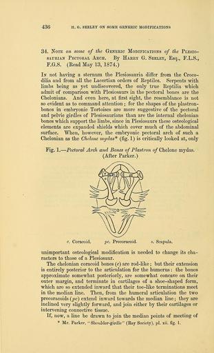 Keywords: The Quarterly journal of the Geological Society of London (12734064723).jpg OF THE PLESIOSAUEIAN PECTOKAX AECH 437 <br> the precoracoids and coracoids and a thin film of ossified connective <br> tissue extend over the interspace between them and unite these <br> bones respectively on each side of the animal a pair of coracoid <br> bones will be constituted similar in form position and relation to <br> those which characterize the Plesiosauria the only difference being <br> that in Plesiosaurs the precoracoid is connate with the coracoid as <br> in the Ostrich and many Lizards ; while in Chelonians it is connate <br> with the scapula s but much importance cannot be attached to the <br> condition of the precoracoid since no one will contend that Plesio- <br> saurs are either Lizards or Tortoises ; while among Amphibians the <br> precoracoid is a distinct bone so placed that it might combine indif- <br> ferently with coracoid or scapula <br> It is a noteworthy fact familiar to all who collect Plesiosaurian <br> coracoids from soft strata that the whole of this triangular inter- <br> space between the precoracoid and coracoid parts which I covered <br> in the Turtle with an imaginary thin ossification is liable to be <br> broken away in extricating the fossil ; and then there remains only <br> a curious bone forked from the humeral articular surface which <br> closely resembles the precoraco-coracoid portion of the chelonian <br> pectoral arch just described and in which only the precoracoid parts <br> similarly meet each other in the median line A beautiful example <br> of such a specimen from the Kimmeridge Clay presented by J C <br> Mansell-Pleydell Esq is exhibited in the British Museum fig 2 <br> Fig 2 ” Coracoids of Hurgenosanrus <br> Showing connation of coracoid c and precoracoid pc <br> Such a specimen goes far to justify an interpretation of the Plesio- <br> saurian coracoids as the combined coracoid and precoracoid bones <br> The Chelonian however has the form of its pectoral and pelvic <br> arches modified by the enormous amount of potential epiphysial <br> ossification which characterizes the subclass The epipleural carti- <br> lages of the Crocodile and the small epipleural bones of Hatteria <br> and of Birds are among Chelonians changed by potential growth <br> into ossifications in comparison with which the original pleural ele- <br> ments are small ; while they so grow and unite that an epipleural <br> skeleton is formed encased not in muscles as in most other ani- <br> mals but in representatives of muscles now converted in most <br> Chelonians into horny scutes corresponding with muscles in their <br> extension <br> It is at present standing over the remains of Megalosaurus without osteo- <br> logical determination and is placed upside down 35766358 110599 51125 Page 436 Text v 30 http //www biodiversitylibrary org/page/35766358 1874 Geological Society of London NameFound Hatteria NameConfirmed Hatteria NameBankID 211227 NameFound Megalosaurus NameConfirmed Megalosaurus EOLID 13154127 NameBankID 4234935 Biodiversity Heritage Library The Quarterly journal of the Geological Society of London v 30 1874 Geology Periodicals Smithsonian Libraries bhl page 35766358 dc identifier http //biodiversitylibrary org/page/35766358 smithsonian libraries Information field Flickr posted date ISOdate 2014-02-24 Check categories 2015 August 26 CC-BY-2 0 BioDivLibrary https //flickr com/photos/61021753 N02/12734064723 2015-08-26 19 57 30 cc-by-2 0 PD-old-70-1923 The Quarterly journal of the Geological Society of London 1874 Photos uploaded from Flickr by Fæ using a script |