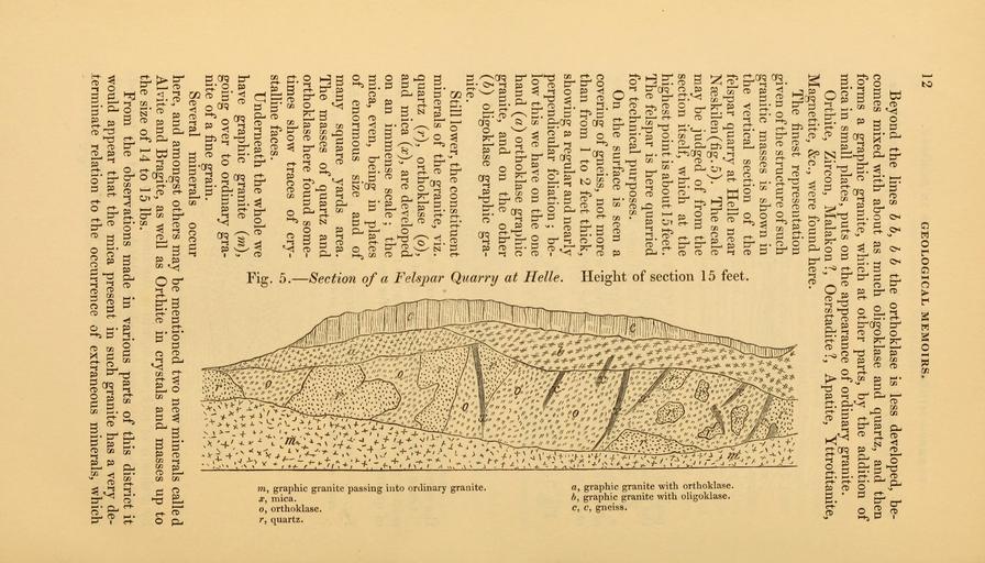 Keywords: The Quarterly journal of the Geological Society of London (12712067234).jpg 12 <br> GEOLOGICAL MEMOIRS <br> J- o <br> « o <br> – £ <br> Ci 5S <br> -' t- <br> U u to <br> Beyond the lines b b b b the orthoklase is less developed be- <br> comes mixed with about as much oligoklase and quartz and then <br> forms a graphic granite which at other parts by the addition of <br> mica in small plates puts on the appearance of ordinary granite <br> Orthite Zircon Malakon Oerstadite Apatite Yttrotitanite <br> Magnetite c M ere found here <br> The finest representation <br> given of the structure of such <br> granitic masses is shown in <br> the vertical section of the <br> felspar quarry at Helle near <br> N9eskilen fig 5 The scale <br> may be judged of from the <br> section itself which at the <br> highest point is about 1 5 feet <br> The felspar is here quarried <br> for technical purposes <br> On the surface is seen a <br> covering of gneiss not more <br> than from 1 to 2 feet thick <br> showing a regular and nearly <br> perpendicular foliation ; be- <br> low this we have on the one <br> hand a orthoklase graphic <br> granite and on the other <br> b oligoklase graphic gra- <br> nite <br> Still lower the constituent <br> minerals of the granite viz <br> quartz ' orthoklase o <br> and mica x are developed <br> on an immense scale ; the <br> mica even being in plates <br> of enormous size and of <br> many square yards area <br> The masses of quartz and <br> orthoklase here found some- <br> times show traces of cry- <br> stalline faces <br> Underneath the whole we <br> have graphic granite m <br> going over to ordinary gra- <br> nite of a fine grain <br> Several minerals occur <br> here and amongst others may be mentioned two new minerals calle d <br> Alvite and Bragite as well as Orthite in crystals and masses up to <br> the size of 14 to 15 lbs <br> From the observations made in various parts of this district it <br> would appear that the mica present in such granite has a very de- <br> terminate relation to the occurrence of extraneous minerals which <br> lO <br> 2 <br> o <br> o <br> so <br> o <br> y a <br> u-g CS 35615220 110213 51125 Page 12 Text v 11 http //www biodiversitylibrary org/page/35615220 1855 Geological Society of London Biodiversity Heritage Library The Quarterly journal of the Geological Society of London v 11 1855 Geology Periodicals Smithsonian Libraries bhl page 35615220 dc identifier http //biodiversitylibrary org/page/35615220 smithsonian libraries Information field Flickr posted date ISOdate 2014-02-23 Check categories 2015 August 26 CC-BY-2 0 BioDivLibrary https //flickr com/photos/61021753 N02/12712067234 2015-08-26 19 58 06 cc-by-2 0 PD-old-70-1923 The Quarterly journal of the Geological Society of London 1855 Photos uploaded from Flickr by Fæ using a script |