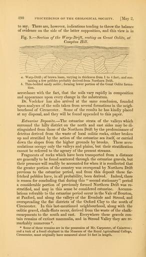 Keywords: The Quarterly journal of the Geological Society of London (12711584245).jpg 490 <br> PROCEEDINGS OF THE GEOLOGICAL SOCIETY May 2 <br> to say There are however mdications tending to throw the balance <br> of evidence on the side of the latter supposition and this view is in <br> Fig 9 ” Section of the Warp-Drift resting on Great Oolite at <br> Compton Hill <br> a Warp-Drift ; of brown loam varying in thickness from 1 to 4 feet ; and con- <br> taining a few pebbles probably derived from Northern Drift <br> b Thin-bedded sandy oolite ; forming lower portion of the Great Oolite forma- <br> tion <br> accordance with the fact that the soils vary rapidly in composition <br> and appearance upon every change in the substratum <br> Dr Voelcker has also arrived at the same conclusion founded <br> upon analyses of the soils taken from several formations in the neigh- <br> bourhood of Cirencester Some of the results he has kindly placed <br> at my disposal and they will be found appended to this paper <br> Estuarine Deposits ” The estuarine strata of the valleys which <br> surround the hilly district on the north and east sides may be di- <br> stinguished from those of the Northern Drift by the predominance of <br> detritus derived from the waste of local oolitic rocks either broken <br> up and stratified by the action of the estuarine sea itself or carried <br> down the slopes from the higher grounds by brooks These accu- <br> mulations occupy only the valleys and plains but their stratification <br> cannot be referred to the agency of the present streams <br> Fragments of rocks which have been transported from a distance <br> are generally to be found scattered through the estuarine gravels but <br> their presence will readily be accounted for when it is recollected that <br> the greater portion of the country was overspread by Northern Drift <br> previous to the estuarine period and from this deposit these far- <br> fetched pebbles have in all probability been derived Indeed there <br> is reason for concluding that during this ' second stationary period <br> a considerable portion of pre\iously formed Northern Drift was re- <br> stratified and may in this sense be considered estuarine Accumu- <br> lations referable to the estuarine period occur in the Vale of Bourton <br> at Paxford and along the valleys of the Evenlode and Stroud and <br> overspreading the flat districts of the Oxford Clay to the south of <br> Cirencester In this last-mentioned neighbourhood along with the <br> oolitic gravel chalk-flints occur derived from the waste of the chalk- <br> escarpments to the south and east Everywhere these gravels con- <br> tain remains of extinct mammalia and in Stroud Valley they are re- <br> markably numerous <br> Some of these remains are in the possession of Mr Carpenter of Caincross ; <br> and a tusk of a fossU elephant in the Museum of the Royal Agricultural College <br> Cirencester must originally have measured about 14 feet in length 35615092 110213 51125 Page 490 Text v 11 http //www biodiversitylibrary org/page/35615092 1855 Geological Society of London Biodiversity Heritage Library The Quarterly journal of the Geological Society of London v 11 1855 Geology Periodicals Smithsonian Libraries bhl page 35615092 dc identifier http //biodiversitylibrary org/page/35615092 smithsonian libraries Information field Flickr posted date ISOdate 2014-02-23 Check categories 2015 August 26 CC-BY-2 0 BioDivLibrary https //flickr com/photos/61021753 N02/12711584245 2015-08-26 21 01 33 cc-by-2 0 PD-old-70-1923 The Quarterly journal of the Geological Society of London 1855 Photos uploaded from Flickr by Fæ using a script |
