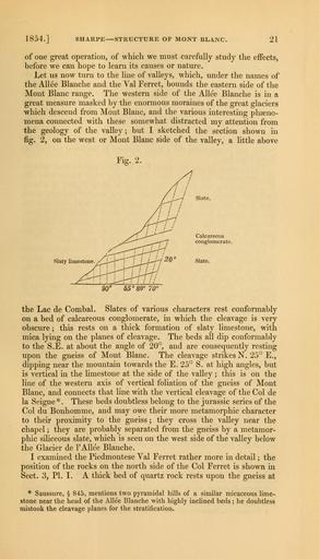 | Keywords: The Quarterly journal of the Geological Society of London (12711464723).jpg 1854 <br> SHARPE ” STRUCTURE OF MONT BLANC <br> 21 <br> of one great operation of which we must carefully study the effects <br> before we can hope to learn its causes or nature <br> Let us now turn to the line of valleys which under the names of <br> the Allee Blanche and the Val Ferret bounds the eastern side of the <br> Mont Blanc range The western side of the Alle'e Blanche is in a <br> great measure masked by the enormous moraines of the great glaciers <br> which descend from Mont Blanc and the various interesting phseno- <br> mena connected with these somewhat distracted my attention from <br> the geology of the valley ; but I sketched the section shown in <br> fig 2 on the west or Mont Blanc side of the valley a little above <br> Fig 2 <br> Slaty limestone <br> Slate <br> Calcareous <br> conglomerate <br> Slate <br> 90 85° 80 70 <br> the Lac de Combal Slates of various characters rest conformably <br> on a bed of calcareous conglomerate in which the cleavage is very <br> obscure ; this rests on a thick formation of slaty limestone with <br> mica lying on the planes of cleavage The beds all dip conformably <br> to the S E at about the angle of 20° and are consequently resting <br> upon the gneiss of Mont Blanc The cleavage strikes N 25° E <br> dipping near the mountain towards the E 25° S at high angles but <br> is vertical in the limestone at the side of the valley ; this is on the <br> line of the western axis of vertical foliation of the gneiss of Mont <br> Blanc and connects that line with the vertical cleavage of the Col de <br> la Seigne These beds doubtless belong to the Jurassic series of the <br> Col du Bonhomme and may owe their more metamorphic character <br> to their proximity to the gneiss ; they cross the valley near the <br> chapel ; they are probably separated from the gneiss by a metamor- <br> phic siliceous slate which is seen on the west side of the valley below <br> the Glacier de 1' Allee Blanche <br> I examined the Piedmontese Val Ferret rather more in detail ; the <br> position of the rocks on the north side of the Col Ferret is shown in <br> Sect 3 PI I A thick bed of quartz rock rests upon the gneiss at <br> Saussure § 845 mentions two pyramidal hills of a similar micaceous lime- <br> stone near the head of the Allee Blanche with highly inclined beds ; he doubtless <br> mistook the cleavage planes for the stratification 35614579 110213 51125 Page 21 Text v 11 http //www biodiversitylibrary org/page/35614579 1855 Geological Society of London Biodiversity Heritage Library The Quarterly journal of the Geological Society of London v 11 1855 Geology Periodicals Smithsonian Libraries bhl page 35614579 dc identifier http //biodiversitylibrary org/page/35614579 smithsonian libraries Information field Flickr posted date ISOdate 2014-02-23 Check categories 2015 August 26 CC-BY-2 0 BioDivLibrary https //flickr com/photos/61021753 N02/12711464723 2015-08-26 20 56 27 cc-by-2 0 PD-old-70-1923 The Quarterly journal of the Geological Society of London 1855 Photos uploaded from Flickr by Fæ using a script |