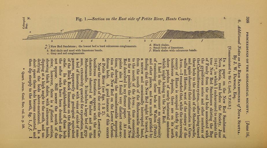 | Keywords: The Quarterly journal of the Geological Society of London (12684359115).jpg 398 <br> PROCEEDINGS OF THE GEOLOGICAL SOCIETY June 16 <br> 6 Additional Notes on the Red Sandstones q/ Nova Scotia <br> By J W Dawson Esq <br> Communicated by Sir C Lyell V P G S <br> ' ' In a paper on the New Red Sandstone of <br> Nova Scotia read before the Society June <br> 1 84 7 in which I endeavoured to separate the <br> / true New Red Sandstones skirting the Bay <br> \ of Fundy from the red beds associated with <br> the gypsiferous series and other members of <br> the Carboniferous system ” after having traced <br> 'I these beds to the mouth of the Shubenacadie <br> -J and again observed their continuation in Corn- <br> § wallis and Horton west of the estuary of the <br> I ' Avon ” I remarked that while the intervening <br> I o county of Hants is occupied chiefly by car- <br> ¢ boniferous deposits there are on its north <br> S ° 23 shore patches of nearly horizontal sandstone <br> i which might belong to the New Red <br> -g rM I had in the past summer an opportunity <br> S 1 1 of examining these beds at Walton Petite <br> ¢Â« and other places and was much gratified by <br> finding that the New Red might be traced as <br> a narrow and occasionally interrupted band <br> from the mouth of the Shubenacadie nearly <br> I to the mouth of the Avon ; thus connecting <br> I as far as possible the distinct patches of New <br> 'W3 Red described in my former paper At some <br> 8 points also I found very distinct coast-sec- <br> 1 tions showing the unconformable superposi- <br> I tion of the New Red on the Lower Carboni- <br> ferous beds A good instance of this occurs <br> I at Petite River see figs 1 2 <br> rt Near the mouth of the river the Lower Car- <br> 's - boniferous formation appears with the same <br> I characters observed at Windsor and on the <br> I I Shubenacadie It includes a large bed of gyp- <br> 2 1 sum extensively quarried for exportation and <br> tl 1 1 a bed of limestone with veins of oxide of man- <br> I g-i ganese apparently the geological equivalent <br> 1 J 8 of the Black Rock limestone on the Shubena- <br> tg § g cadie In the neighbourhood of these beds <br> I ll the softer rocks have been denuded and do <br> Z appear Still nearer the mouth of the <br> «o river however there is a distinct section <br> J - J « showing black shales with calcareous bands <br> dipping at a high angle to the south and un- <br> derlying the beds above-mentioned In a <br> short space these beds become contorted and <br> then dip steeply to the north fig \ f f I <br> Quart Journ Geol Soc vol iv p 50 35461468 109911 51125 Page 398 Text v 8 http //www biodiversitylibrary org/page/35461468 1852 Geological Society of London Biodiversity Heritage Library The Quarterly journal of the Geological Society of London v 8 1852 Geology Periodicals Smithsonian Libraries bhl page 35461468 dc identifier http //biodiversitylibrary org/page/35461468 smithsonian libraries Information field Flickr posted date ISOdate 2014-02-21 Check categories 2015 August 26 CC-BY-2 0 BioDivLibrary https //flickr com/photos/61021753 N02/12684359115 2015-08-26 20 58 48 cc-by-2 0 PD-old-70-1923 The Quarterly journal of the Geological Society of London 1852 Photos uploaded from Flickr by Fæ using a script |