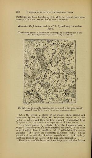 | Keywords: The Quarterly journal of the Geological Society of London (14096454663).jpg 158 <br> F ETJTLET ON BEECCIATED POKPIDO-ROSSO ANTICO <br> crystalline and has a bluish-grey tint while the cement has a more <br> coarsely crystalline texture and is nearly colourless <br> Brecciated Porjldo-rosso antico x 18 ; by ordinary transmitted <br> light <br> The siliceous cetnent is indicated on the margin by the letter C and a line <br> The distinctly-drawn crystals are chiefly hornblende <br> w mwM <br> Â¥m <br> – O rf <br> 41 <br> ri <br> FrcuvKH rU lii <br> The difference between the fragments and the cement is still more strongly <br> mai'ked when the section is viewed between crossed nicols <br> When the section is placed on an opaque white ground and <br> examined by reflected light the fragments appear of a pale <br> yellowish colour and their borders which by transmitted light <br> appeared dark now exhibit a deep yellowish or coffee-colour <br> On a black ground by reflected light the fragments have a <br> yellowish-red colour with a more intensely red border in the outer <br> edge of which there is usually a belt of yellowish-white opaque <br> granules The latter are apparent kaolinized felspar ” similar <br> granules flecks and altered felspar crystals occurring irregularly <br> scattered through the interior of the porphyrite fragments <br> The character of the borders of these fragments indicates decom- 37047004 114009 51125 Page 158 Text 41 http //www biodiversitylibrary org/page/37047004 1885 Geological Society of London Biodiversity Heritage Library The Quarterly journal of the Geological Society of London v 41 1885 Geology Periodicals Smithsonian Libraries bhl page 37047004 dc identifier http //biodiversitylibrary org/page/37047004 smithsonian libraries Information field Flickr posted date ISOdate 2014-04-30 Check categories 2015 August 26 CC-BY-2 0 BioDivLibrary https //flickr com/photos/61021753 N02/14096454663 2015-08-26 04 54 30 cc-by-2 0 PD-old-70-1923 The Quarterly journal of the Geological Society of London 1885 Photos uploaded from Flickr by Fæ using a script |