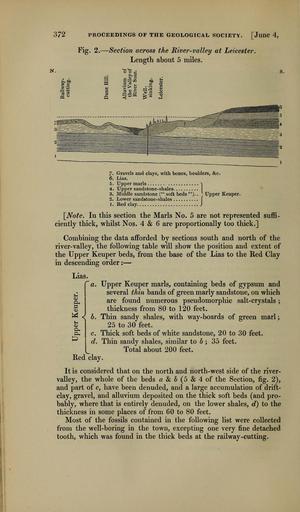 Keywords: The Quarterly journal of the Geological Society of London (12683255975).jpg 372 <br> PROCEEDINGS OF THE GEOLOGICAL SOCIETY June 4 <br> Fig 2 Section across the River-valley at Leicester <br> Length about 5 miles <br> N <br> ts a <br> p ; <br> a <br> i '3 <br> 7 Gravels and clays with bones boulders c <br> 6 Lias <br> 5 Upper marls <br> 4 Upper sandstone-shales <br> 3 Middle sandstone soft beds J Upper Keuper <br> 2 Lower sandstone-shales <br> 1 Red clay <br> i <br> Note In this section the Marls No 5 are not represented suffi- <br> ciently thick whilst Nos 4 6 are proportionally too thick <br> Combining the data afforded by sections south and north of the <br> river-valley the following table will show the position and extent of <br> the Upper Keuper beds from the base of the Lias to the Red Clay <br> in descending order <br> Lias <br> a <br> Upper Keuper marls containing beds of gypsum and <br> several thin bands of green marly sandstone on which <br> are found numerous pseudomorphic salt-crystals ; <br> thickness from 80 to 120 feet <br> b Thin sandy shales with way-boards of green marl ; <br> 25 to 30 feet <br> c Thick soft beds of white sandstone 20 to 30 feet <br> d Thin sandy shales similar to 5 ; 35 feet <br> Total about 200 feet <br> Red clay <br> It is considered that on the north and north-west side of the river- <br> valley the whole of the beds « 5 5 4 of the Section fig 2 <br> and part of c have been denuded and a large accumulation of drift- <br> clay gravel and alluvium deposited on the thick soft beds and pro- <br> bably where that is entirely denuded on the lower shales d to the <br> thickness in some places of from 60 to 80 feet <br> Most of the fossils contained in the following list were collected <br> from the well-boring in the town excepting one very fine detached <br> tooth which was found in the thick beds at the railway -cutting 35338827 109655 51125 Page 372 Text v 12 http //www biodiversitylibrary org/page/35338827 1856 Geological Society of London Biodiversity Heritage Library The Quarterly journal of the Geological Society of London v 12 1856 Geology Periodicals Smithsonian Libraries bhl page 35338827 dc identifier http //biodiversitylibrary org/page/35338827 smithsonian libraries Information field Flickr posted date ISOdate 2014-02-21 Check categories 2015 August 26 CC-BY-2 0 BioDivLibrary https //flickr com/photos/61021753 N02/12683255975 2015-08-27 11 57 18 cc-by-2 0 PD-old-70-1923 The Quarterly journal of the Geological Society of London 1856 Photos uploaded from Flickr by FÊ using a script |