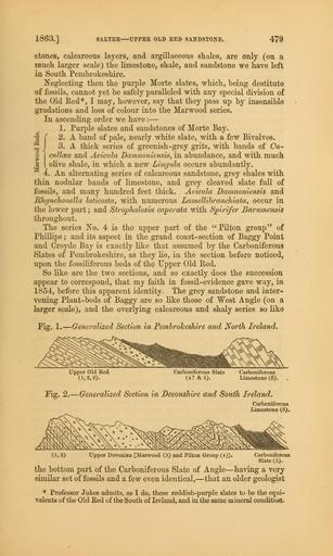 Keywords: The Quarterly journal of the Geological Society of London (12646325234).jpg 1863 <br> SALTER UPPER OLD RED SANDSTONE <br> 479 <br> stones calcareous layers and argillaceous shales are only on a <br> much larger scale the limestone shale and sandstone we have left <br> in South Pembrokeshire <br> Neglecting then the purple Morte slates which being destitute <br> of fossils cannot yet be safely paralleled with any special division of <br> the Old Red I may however say that they pass up by insensible <br> gradations and loss of colour into the Marwood series <br> In ascending order we have <br> 1 Purple slates and sandstones of Morte Bay <br> 2 A band of pale nearly white slate with a few Bivalves <br> 3 A thick series of greenish-grey grits with bands of Cu- <br> cullcea and Avicula Damnoniensis in abundance and with much <br> olive shale in which a new Lingida occurs abundantly <br> 1 4 An alternating series of calcareous sandstone grey shales with <br> thin nodular bands of limestone and grey cleaved slate full of <br> fossils and many hundred feet thick Avicula Damnoniensis and <br> Hhynchonella laticosta with numerous Lamellibranchiata occur in <br> the lower part ; and Strophalosia caperata with Spirifer Barumensis <br> throughout <br> The series No 4 is the upper part of the Pilton group of <br> Phillips ; and its aspect in the grand coast- section of Baggy Point <br> and Croyde Bay is exactly like that assumed by the Carboniferous <br> Slates of Pembrokeshire as they lie in the section before noticed <br> upon the fossiliferous beds of the Upper Old Bed <br> So like are the two sections and so exactly does the succession <br> appear to correspond that my faith in fossil-evidence gave way in <br> 1854 before this apparent identity The grey sandstone and inter- <br> vening Plant-beds of Baggy are so like those of West Angle on a <br> larger scale and the overlying calcareous and shaly series so like <br> Fig 1 Generalized Section in Pembrokeshire and North Ireland <br> Upper Old Red <br> 1 2 3 <br> Carboniferous Slate <br> 4 5 <br> Carboniferous <br> Limestone 6 <br> Fig 2 Generalized Section in Devonshire and South Ireland <br> Carboniferous <br> Limestone 6 <br> 1 2 <br> Upper Devonian Marwood 3 and Piltoa Group 4 <br> Carboniferous <br> Slate 5 <br> the bottom part of the Carboniferous Slate of Angle having a very <br> similar set of fossils and a few even identical that an older geologist <br> Professor Jukes admits as I do these reddish-purple slates to be the equi- <br> valents of the Old Red of the South of Ireland and in the same mineral condition 35328466 109632 51125 Page 479 Text v 19 http //www biodiversitylibrary org/page/35328466 1863 Geological Society of London NameFound Avicula NameConfirmed Avicula EOLID 10721231 NameBankID 4633901 NameFound Damnoniensis NameFound Hhynchonella laticosta NameConfirmed Rhynchonella laevicosta NameFound Lamellibranchiata NameConfirmed Lamellibranchiata EOLID 2215 NameBankID 5049506 NameFound Spirifer NameConfirmed Spirifer NameBankID 4349330 NameFound Strophalosia caperata Biodiversity Heritage Library The Quarterly journal of the Geological Society of London v 19 1863 Geology Periodicals Smithsonian Libraries bhl page 35328466 dc identifier http //biodiversitylibrary org/page/35328466 smithsonian libraries Information field Flickr posted date ISOdate 2014-02-20 Check categories 2015 August 26 CC-BY-2 0 BioDivLibrary https //flickr com/photos/61021753 N02/12646325234 2015-08-27 11 51 57 cc-by-2 0 PD-old-70-1923 The Quarterly journal of the Geological Society of London 1863 Photos uploaded from Flickr by FĂŚ using a script |
