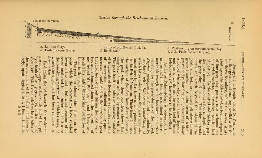 Keywords: The Quarterly journal of the Geological Society of London (12645942103).jpg of <br> them to this paper <br> The peat has almost thinned out at the <br> point which the excavations have reached <br> towards the east ; but what remains of it <br> seems unaltered in character as if it were <br> the remaining portion of a thicker mass of <br> which the upper part has been removed by <br> denudation <br> In digging the brick-earth the workmen <br> are now stopped at the south end of the pit <br> by a bank of sandy gravel c with a slope of <br> about 30° This I concluded to be a talus of <br> the ancient bank of the valley ; and accord- <br> ingly upon digging into it I found that its <br> 2e2 35328366 109632 51125 Page 395 Text v 19 http //www biodiversitylibrary org/page/35328366 1863 Geological Society of London NameFound Elephas primigenius NameConfirmed Elephas primigenius NameBankID 5716812 Biodiversity Heritage Library The Quarterly journal of the Geological Society of London v 19 1863 Geology Periodicals Smithsonian Libraries bhl page 35328366 dc identifier http //biodiversitylibrary org/page/35328366 smithsonian libraries Information field Flickr posted date ISOdate 2014-02-20 Check categories 2015 August 26 CC-BY-2 0 BioDivLibrary https //flickr com/photos/61021753 N02/12645942103 2015-08-27 11 59 25 cc-by-2 0 PD-old-70-1923 The Quarterly journal of the Geological Society of London 1863 Photos uploaded from Flickr by Fæ using a script |