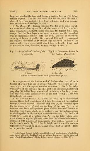 | Keywords: The Quarterly journal of the Geological Society of London (12645765045).jpg  1863 <br> DAWKINS HY ENA-DEN NEAR WELLS <br> 265 <br> long had reached the floor and formed a vertical bar as if to forbid <br> further ingress The last portion of this branch for a distance of <br> about 6 feet was perfectly free from sediment and was covered <br> here and there with stalagmitic crusts <br> 4 The Passage D  Having explored C as far as we could crawl <br> we commenced clearing out D and discovered a third layer of or- <br> ganic remains presenting the same section as the former bone -beds <br> except that the dark layer was absent in places and the bone-bed <br> was in immediate contact with the roof Besides an enormous <br> quantity of bones it yielded 45 jaws and 120 teeth It occupied <br> the whole of the width of D and its edge rested on the floor of the <br> eastern side Its average width w r as 6 feet its length 14 feet ; and <br> its square area was therefore 84 feet see figs 1 and 7 <br> Fig 7  Longitudinal Section of the Fig 8  Transverse Section in <br> Passage D the Vertical Passage E <br> / Sand d Grey clay <br> For the explanation of the other symbols see Figs 2-6 <br> As we approached the further end of the bone-bed the red earth <br> became of a paler hue and of greater tenacity; the stones also be- <br> came larger and the organic remains more rare At its further edge <br> was a layer of fine sand / fig 7 4 inches in thickness underlying <br> grey clay d full of large stones ' and containing a few large bones <br> This latter extended completely up to the roof see fig 7 and was <br> 20 inches in thickness <br> 5 The Vertical Passage E  From this point up to the vertical <br> passage E see fig 7 a distance of 4 feet there was not the slightest <br> vestige of bones or teeth The stiff grey clay d fig 8 rested upon <br> the horizontal layer of sand on the floor of the cave f In the <br> former a most beautifully polished piece of chert from the Mountain- <br> limestone was found which as its surface is very irregular appears <br> to owe its polish to friction upon some soft substance Dr Buckland <br> would have called it a rubbing-stone In the latter also there <br> were numerous angular pieces of chert from the Mountain -limestone <br> associated with peroxide of manganese The vertical passage took <br> the form of a vault fig 7 6 feet in height and 4 in width and was <br> represented overhead by an opening 1 square foot in extent Here <br> our exploration ended <br> In the bears' dens of Zahnloch and G-ailenreuth similar traces of polishing <br> were found which Dr Buckland assigns without hesitation to the skin and <br> paws of antediluvian bears Reliq Diluv second edition pp 132 137 35328230 109632 51125 Page 265 Text v 19 http //www biodiversitylibrary org/page/35328230 1863 Geological Society of London Biodiversity Heritage Library The Quarterly journal of the Geological Society of London v 19 1863 Geology Periodicals Smithsonian Libraries bhl page 35328230 dc identifier http //biodiversitylibrary org/page/35328230 smithsonian libraries Information field Flickr posted date ISOdate 2014-02-20 Check categories 2015 August 26 CC-BY-2 0 BioDivLibrary https //flickr com/photos/61021753 N02/12645765045 2015-08-27 11 00 05 cc-by-2 0 PD-old-70-1923 The Quarterly journal of the Geological Society of London 1863 Photos uploaded from Flickr by FĂŚ using a script |