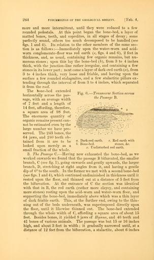 | Keywords: The Quarterly journal of the Geological Society of London (12645890053).jpg  264 pitoeiiBDiXGS oe the geological society Feb 4 <br> more and more intermittent until they were reduced to a few <br> rounded pedestals At this point began the bone-bed a layer of <br> matted bones teeth and coprolites in all stages of decay ; some <br> perfectly sound others too much decomposed to be handled see <br> figs 1 and 4 Its relation to the other members of the same sec- <br> tion is as follows ” Immediately upon the water-worn and acid- <br> worn conglomerate-floor was red earth e figs 4 and 6 2 feet in <br> thickness and as usual containing few organic remains but nu- <br> merous stones; upon this lay the bone-bed 6 from 3 to 4 inches <br> thick with the junction -line rather irregular and containing a few <br> stones in its lower part ; next came a layer of dark-red earth a from <br> 3 to 4 inches thick very loose and friable and having upon the <br> surface a few rounded stalagmites and a few stalactitic pillars ex- <br> tending through the interval of from 3 to 4 inches which separated <br> it from the roof <br> The bone-bed extended _ _ m <br> horizontally across the pas- Fl ' ”Transverse Section across <br> sage with an average width the Passa 9 e B ' <br> of 7 feet and a length of <br> 14 feet affording therefore <br> a square area of 98 feet <br> The enormous quantity of <br> organic remains present can- <br> not be estimated even by the <br> large number we have pre- <br> served The 243 bones the <br> 64 jaws and 240 teeth ob- <br> tained from it are to be a - ark-red earth e Eed earth with <br> 1 j –  h Bone-bed stones c <br> looked upon merely as a x Undisturbed red earth <br> small fraction of the whole <br> 3 The Passage C ” Having now exhausted the bone-bed as we <br> worked onwards we found that the passage B bifurcated the smaller <br> branch C see fig 1 going onwards and gently upwards the larger <br> branch D stretching at right angles from it and having a gentle <br> dip of 6° to the south In the former we met with a second bone-bed <br> see figs 1 and 4 which continued undiminished in thickness until it <br> rested upon the floor and thinned out at a distance of 5 feet from <br> the bifurcation At the entrance of C the section was identical <br> with that in B the red earth rather more clayey and containing <br> more stones resting upon the acid-worn and water- worn floor and <br> supporting the bone-bed immediately above which was a thin layer <br> of dark friable earth This at the further end owing to the thin- <br> ning out of the beds underneath was superimposed directly upon <br> the floor until it likewise thinned out The bone-bed extended <br> through the whole width of C affording a square area of about 15 <br> feet Besides bones it yielded 8 jaws of Hyama and 46 teeth and <br> 41 bones of various animals The passage was but 15 or 16 inches <br> high and about 3 feet in width ; it gradually narrowed until at a <br> distance of 12 feet from the bifurcation a stalactite about 6 inches 35328229 109632 51125 Page 264 Text v 19 http //www biodiversitylibrary org/page/35328229 1863 Geological Society of London NameFound Passa NameConfirmed Passa NameBankID 2996737 Biodiversity Heritage Library The Quarterly journal of the Geological Society of London v 19 1863 Geology Periodicals Smithsonian Libraries bhl page 35328229 dc identifier http //biodiversitylibrary org/page/35328229 smithsonian libraries Information field Flickr posted date ISOdate 2014-02-20 Check categories 2015 August 26 CC-BY-2 0 BioDivLibrary https //flickr com/photos/61021753 N02/12645890053 2015-08-27 11 51 09 cc-by-2 0 PD-old-70-1923 The Quarterly journal of the Geological Society of London 1863 Photos uploaded from Flickr by Fæ using a script |