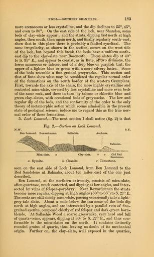 | Keywords: The Quarterly journal of the Geological Society of London (12645845013).jpg NICOL SOUTHERN GRAMPIANS <br> 183 <br> more arenaceous or less crystalline and the dip declines to 55° 45° <br> and even to 30° On the east side of the loch near Shandon some <br> beds of clay-slate appear; and the strata dipping first north at high <br> angles then south then again north and finally regularly south-east <br> show that in this place there is probably a faulted synclinal The <br> same irregularity as shown in the section occurs on the west side <br> of the loch but beyond this break the beds have a uniform south- <br> east dip to the clay-slate near Koseneath These slates dip at 40° <br> to S 35° E and appear to consist as in Bute of two divisions the <br> lower micaceous or talcose and of a deep blue or purplish tint the <br> upper of a lighter blue or green with a more silvery lustre Some <br> of the beds resemble a fine-grained greywacke This section and <br> that of Bute show what may be considered the regular normal order <br> of the formations on the south border of the western Grampians <br> First towards the axis of the chain the more highly crystalline and <br> contorted mica-slate covered by less crystalline and more even beds <br> of the same rock and these in turn by talcose or chloritic blue and <br> green clay-slates with occasional beds of greywacke The low and <br> regular dip of the beds and the conformity of the order to the only <br> theory of metamorphic action which seems admissible in the present <br> state of geological science induce me to regard this as the true nor- <br> mal order of these formations <br> 5 Loch Lomond ” The next section I shall notice fig 2 is that <br> Fig 2 ” Section on Loch Lomond <br> N W <br> Ben Lomond Rowardennan Sallachie Auchmar <br> S E <br> Mica-slate <br> a Syenite <br> Clay-slate <br> b Granite <br> Balmaha <br> b c Old Red <br> Sandstone <br> c Limestone <br> seen on the east side of Loch Lomond from Ben Lomond to the <br> Red Sandstone at Balmaha about ten miles east of the one just <br> described <br> Ben Lomond at the northern extremity consists of mica-slate <br> often quartzose much contorted and dipping at low angles and inter- <br> sected by veins of felspar-porphyry Near Rowardennan the strata <br> become more regular dipping at high angles 80° to 85° to S 27° E <br> The rocks are still chiefly mica-slate passing occasionally into a light- <br> grey talc-slate About a mile below the inn some of the beds dip <br> north at high angles and are intersected by a parallel vein of fine- <br> grained syenite composed chiefly of red felspar and dark-green horn- <br> blende At Sallachie Wood a coarse greywacke very hard and full <br> of quartz-veins appears dipping at 80° to S 27° E and thus con- <br> formable to the mica-slates on the north It contains distinctly <br> rounded grains of quartz thus leaving no doubt of its mechanical <br> origin Further on the clay-slate well exposed in the quarries 35328144 109632 51125 Page 183 Text v 19 http //www biodiversitylibrary org/page/35328144 1863 Geological Society of London Biodiversity Heritage Library The Quarterly journal of the Geological Society of London v 19 1863 Geology Periodicals Smithsonian Libraries bhl page 35328144 dc identifier http //biodiversitylibrary org/page/35328144 smithsonian libraries Information field Flickr posted date ISOdate 2014-02-20 Check categories 2015 August 26 CC-BY-2 0 BioDivLibrary https //flickr com/photos/61021753 N02/12645845013 2015-08-27 11 58 15 cc-by-2 0 PD-old-70-1923 The Quarterly journal of the Geological Society of London 1863 Photos uploaded from Flickr by Fæ using a script |