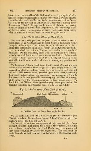 Keywords: The Quarterly journal of the Geological Society of London (12645828023).jpg 1862 HARKNESS SKIDDAW SLATE SERIES 131 <br> however on the east side of the high road a small quarry in which a <br> felstone occurs intermediate in character between a syenite and the <br> greenish rocks ; and a similar rock is also seen south-west from Wast- <br> dale Crag in the direction of Long Sleddale where it is known under <br> the name of flint It is probably a mass of plutonic rock having <br> the same origin as the Wastdale Crag syenite but possessing a less <br> crystalline nature in consequence of more rapid cooling from having <br> been in immediate contact with the greenish-grey rocks <br> § 6 The Skiddaw Slates of Black Comb <br> The most southerly position occupied by the Skiddaw slates in <br> Cumberland or in Westmoreland is Black Comb a mountain rising <br> abruptly to the height of 1919 feet in the south-west of Cumber- <br> land ; it is surrounded on all sides except the west by the greenish- <br> grey rocks which succeed the Skiddaw slate series in the north of <br> England On the west side Black Comb is margined by a compa- <br> ratively low and flat tract of country composed of the Trias sand- <br> stones extending southward from St Bee's Head and flanking on the <br> west side the Silurian rocks and their accompanying granites and <br> syenites <br> To the south of Black Comb there is a flat tract of country which <br> separates this mountain from the greenish-grey craggy rocks of Mil- <br> lom and in which no rocks are seen the area being covered with till <br> and soil Still further south greenish -grey rocks occur exhibiting <br> their usual broken outline and presenting bold escarpments towards <br> the north ” a feature generally accompanying their line of outcrop <br> while on their dip they present commonly a less rugged aspect To <br> the S S E at Millom these greenish-grey rocks pass under the <br> Coniston limestone and Coniston flags which also dip S S E <br> Fig 6 ” Section across Black Comb 5 miles <br> N Whicham S <br> Stoneside-fell Black Comb Till and soil Millom <br> a a Fault a b <br> a Skiddaw Slate b Green slate porphyries c <br> On the north side of the Whicham valley the flat interspace just <br> alluded to where the southern flanks of Black Comb exhibit the <br> Skiddaw slates the beds dip N N W <br> Portions of the southern escarpments of this mountain have been <br> wrought for slate ; and among the debris of the quarries Graptolites <br> may be found though from the Black Comb beds I have obtained <br> only one species namely Gh~aptolites Sagittarius The position of the <br> strata here shows that they are very low down in the Skiddaw slate <br> series <br> k 2 35328090 109632 51125 Page 131 Text v 19 http //www biodiversitylibrary org/page/35328090 1863 Geological Society of London NameFound Graptolites NameConfirmed Graptolites NameBankID 423327 NameFound Sagittarius NameConfirmed Sagittarius EOLID 104370 NameBankID 2473453 Biodiversity Heritage Library The Quarterly journal of the Geological Society of London v 19 1863 Geology Periodicals Smithsonian Libraries bhl page 35328090 dc identifier http //biodiversitylibrary org/page/35328090 smithsonian libraries Information field Flickr posted date ISOdate 2014-02-20 Check categories 2015 August 26 CC-BY-2 0 BioDivLibrary https //flickr com/photos/61021753 N02/12645828023 2015-08-27 12 00 29 cc-by-2 0 PD-old-70-1923 The Quarterly journal of the Geological Society of London 1863 Photos uploaded from Flickr by Fæ using a script |