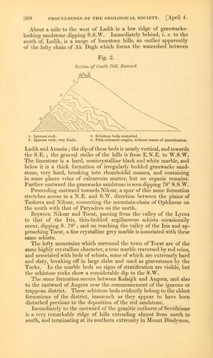 | Keywords: The Quarterly journal of the Geological Society of London (12645343973).jpg 368 <br> PROCEEDINGS OF THE GEOLOGICAL SOCIETY April 4 <br> About a mile to the west of Ladik is a low ridge of grauwacke- <br> looking sandstone dipping S S W Immediately behind i e to the <br> south of Ladik is a range of limestone hills an outUer apparently <br> of the lofty chain of Ak Dagh which forms the watershed between <br> Fig 2 <br> Section of Castle Hill Boiavad <br> -A <br> 1 Igneous rock <br> 2 Igneous rock very fissile <br> 3 Schistose beds contorted <br> 4 Pink-coloured scaglia without traces of stratification <br> Ladik and Amasia ; the dip of these beds is nearly vertical and towards <br> the S E ; the general strike of the hills is from E N E to W S W <br> The limestone is a hard semicrystalline black and white marble and <br> below it is a thick formation of irregularly bedded grauwacke sand- <br> stone very hard breaking into rhomboidal masses and containing <br> in some places veins of calcareous matter but no organic remains <br> Further eastward the grauwacke sandstone is seen dipping 70° S S W <br> Proceeding eastward towards Niksar a spur of this same formation <br> stretches across in a N E and S W direction between the plains of <br> Tashova and Niksar connecting the mountain-chain of Ophlimus on <br> the south with that of Paryadres on the north <br> Between Niksar and Tocat passing from the valley of the Lycus <br> to that of the Iris thin-bedded argillaceous schists occasionally <br> occur dipping S 70° ; and on reaching the valley of the Iris and ap- <br> proaching Tocat a fine crystalline grey marble is associated with these <br> same schists <br> The lofty mountains which surround the town of Tocat are of the <br> same highly crystalline character a true marble traversed by red veins <br> and associated with beds of schists some of which are extremely hard <br> and slaty breaking oif in large slabs and used as gravestones by the <br> Turks In the marble beds no signs of stratification are visible but <br> the schistose rocks show a considerable dip to the S W <br> The same formation occurs between Kalaijik and Angora and also <br> to the eastward of Angora near the commencement of the igneous or <br> trappean district These schistose beds evidently belong to the oldest <br> formations of the district inasmuch as they appear to have been <br> disturbed previous to the deposition of the red sandstone <br> Immediately to the eastward of the granitic outburst of Sevrihissar <br> is a very remarkable ridge of hills extending almost from north to <br> south and terminating at its southern extremity in Mount Dindymus 35269018 109512 51125 Page 368 Text v 5 http //www biodiversitylibrary org/page/35269018 1849 Geological Society of London NameFound Amasia NameConfirmed Amasia NameBankID 4064554 NameFound Dindymus NameConfirmed Dindymus NameBankID 4144006 NameFound Lycus NameConfirmed Lycus EOLID 110488 NameBankID 3002239 Biodiversity Heritage Library The Quarterly journal of the Geological Society of London v 5 1849 Geology Periodicals Smithsonian Libraries bhl page 35269018 dc identifier http //biodiversitylibrary org/page/35269018 smithsonian libraries Information field Flickr posted date ISOdate 2014-02-20 Check categories 2015 August 26 CC-BY-2 0 BioDivLibrary https //flickr com/photos/61021753 N02/12645343973 2015-08-27 10 54 16 cc-by-2 0 PD-old-70-1923 The Quarterly journal of the Geological Society of London 1849 Photos uploaded from Flickr by Fæ using a script |