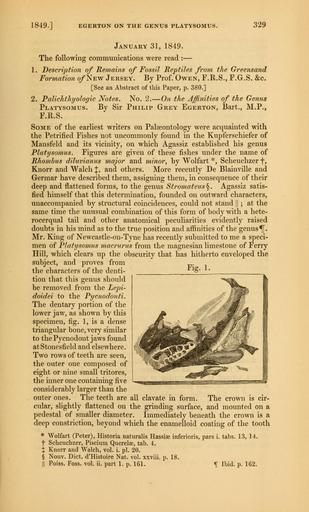 Keywords: The Quarterly journal of the Geological Society of London (12645311573).jpg of Remains of Fossil Reptiles from the Greensand <br> Formation ofi MV Jersey By Prof Owen F R S F G S c <br> See an Abstract of this Paper p 380 <br> 2 Palichthyologic Notes No 2 ” On the Affinities of the Genus <br> Platysomus By Sir Philip Grey Egerton Bart M P <br> F R S <br> Some of the earliest writers on Palaeontology were acquainted with <br> the Petrified Fishes not uncommonly found in the Kupferschiefer of <br> Mansfeld and its vicinity on which Agassiz established his genus <br> Platysomus Figures are given of these fishes under the name of <br> Rhombus diluvianus major and minor by Wolfart Scheuchzer f <br> Knorr and Walch X and others More recently De Blainville and <br> Germar have described them assigning them in consequence of their <br> deep and flattened forms to the genus Stromateus Agassiz satis- <br> fied himself that this determination founded on outward characters <br> unaccompanied by structural coincidences could not stand ; at the <br> same time the unusual combination of this form of body with a hete- <br> rocerqual tail and other anatomical peculiarities evidently raised <br> doubts in his mind as to the true position and affinities of the genus <br> Mr King of Newcastle-on-Tyne has recently submitted to me a speci- <br> men of Platysomus macrurus from the magnesian limestone of Ferry <br> Hill which clears up the obscurity that has hitherto enveloped the <br> subject and proves from <br> the characters of the denti- S' <br> tion that this genus should <br> be removed from the Lepi- <br> doidei to the Pycnodonti <br> The dentary portion of the <br> lower jaw as shown by this <br> specimen fig 1 is a dense <br> triangular bone very similar <br> to thePycnodont jaws found <br> atStonesfield and elsewhere <br> Two rows of teeth are seen <br> the outer one composed of <br> eight or nine small tritores <br> the inner one containing five <br> considerably larger than the <br> outer ones The teeth are all clavate in form The crown is cir- <br> cular slightly flattened on the grinding surface and mounted on a <br> pedestal of smaller diameter Immediately beneath the crown is a <br> deep constriction beyond which the enamelloid coating of the tooth <br> Wolfart Peter Historia naturalis Hassiae inferioris pars i tabs 13 14 <br> t Scheuchzer Piscium Querelre tab 4 <br> X Knorr and Walch vol i pi 20 <br> § Nouv Diet d'Histoire Nat vol xxviii p 18 <br> 11 Poiss Foss vol ii part 1 p 161 \ Ibid p 162 35268979 109512 51125 Page 329 Text v 5 http //www biodiversitylibrary org/page/35268979 1849 Geological Society of London NameFound Hassiae inferioris pars NameFound Historia naturalis NameFound Piscium NameFound Platysomus NameConfirmed Platysomus EOLID 4603513 NameBankID 178222 NameFound Platysomus macrurus NameConfirmed Platysomus macrurus NameFound Rhombus diluvianus major NameFound Stromateus NameConfirmed Stromateus EOLID 11041319 NameBankID 117936 Biodiversity Heritage Library The Quarterly journal of the Geological Society of London v 5 1849 Geology Periodicals Smithsonian Libraries bhl page 35268979 dc identifier http //biodiversitylibrary org/page/35268979 smithsonian libraries Information field Flickr posted date ISOdate 2014-02-20 Check categories 2015 August 26 CC-BY-2 0 BioDivLibrary https //flickr com/photos/61021753 N02/12645311573 2015-08-27 10 52 56 cc-by-2 0 PD-old-70-1923 The Quarterly journal of the Geological Society of London 1849 Photos uploaded from Flickr by Fæ using a script |